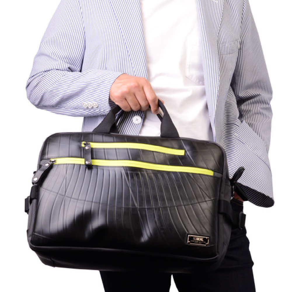 今までにないフィット感で、体への負担を最大限軽減してくれます。ショルダーベルトはすっきりと収納できるのでビジネスバッグとして手持ちで使用した際にも違和感なくご使用いただけます。内部には320mm×230mmまでのPCやタブレットが収納できる緩衝材入りポケットに加え、ファスナーポケットやペンホルダーも完備。収納にも長けたビジネスバッグです。ショルダータイプですので片手で回して簡単に前に持ってくることができ、満員電車での移動の際にも便利です。 このスリングビジネスバッグは、一個辺り約1470gのCO2が削減されます。