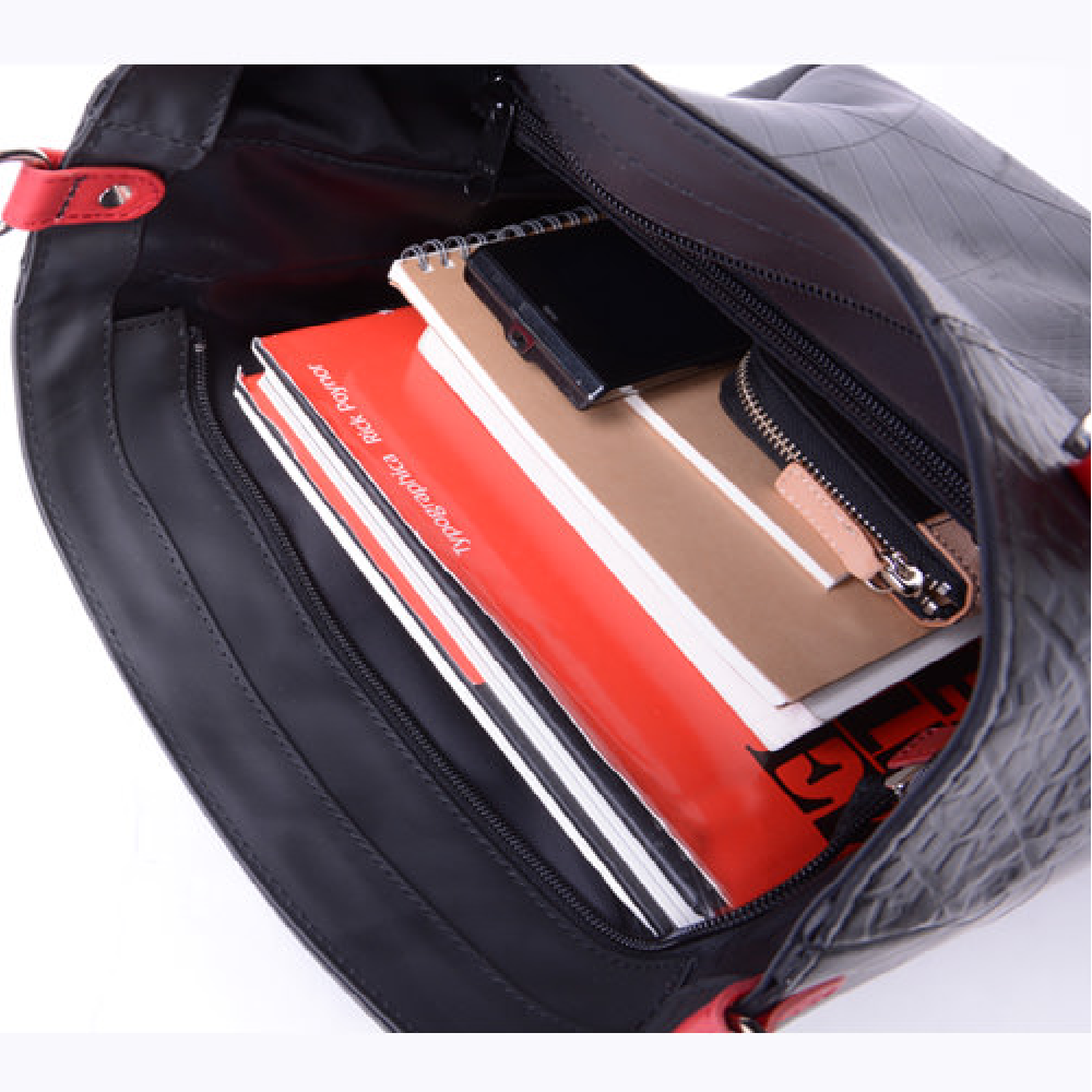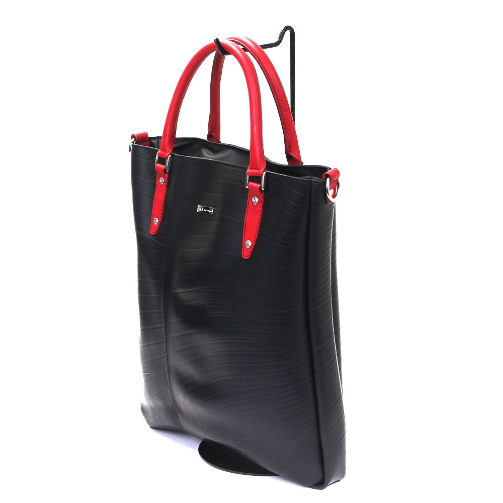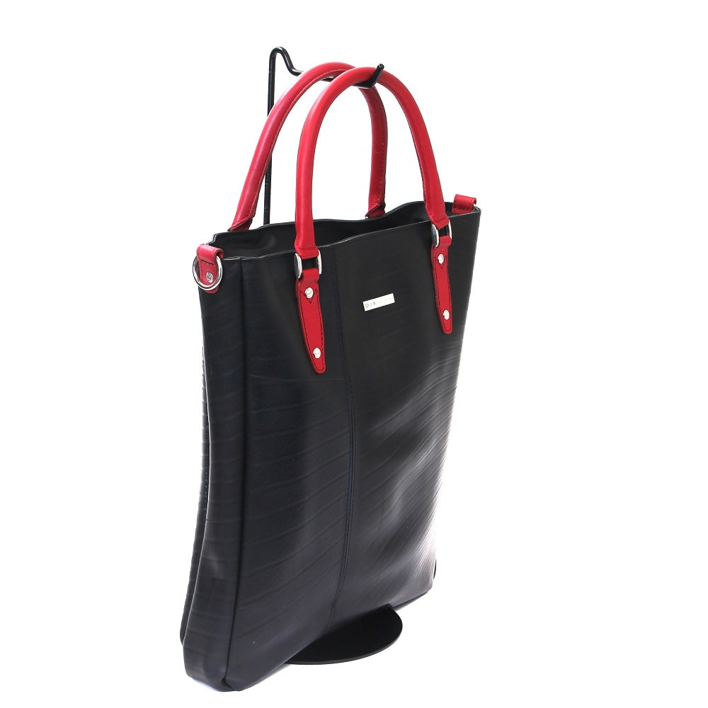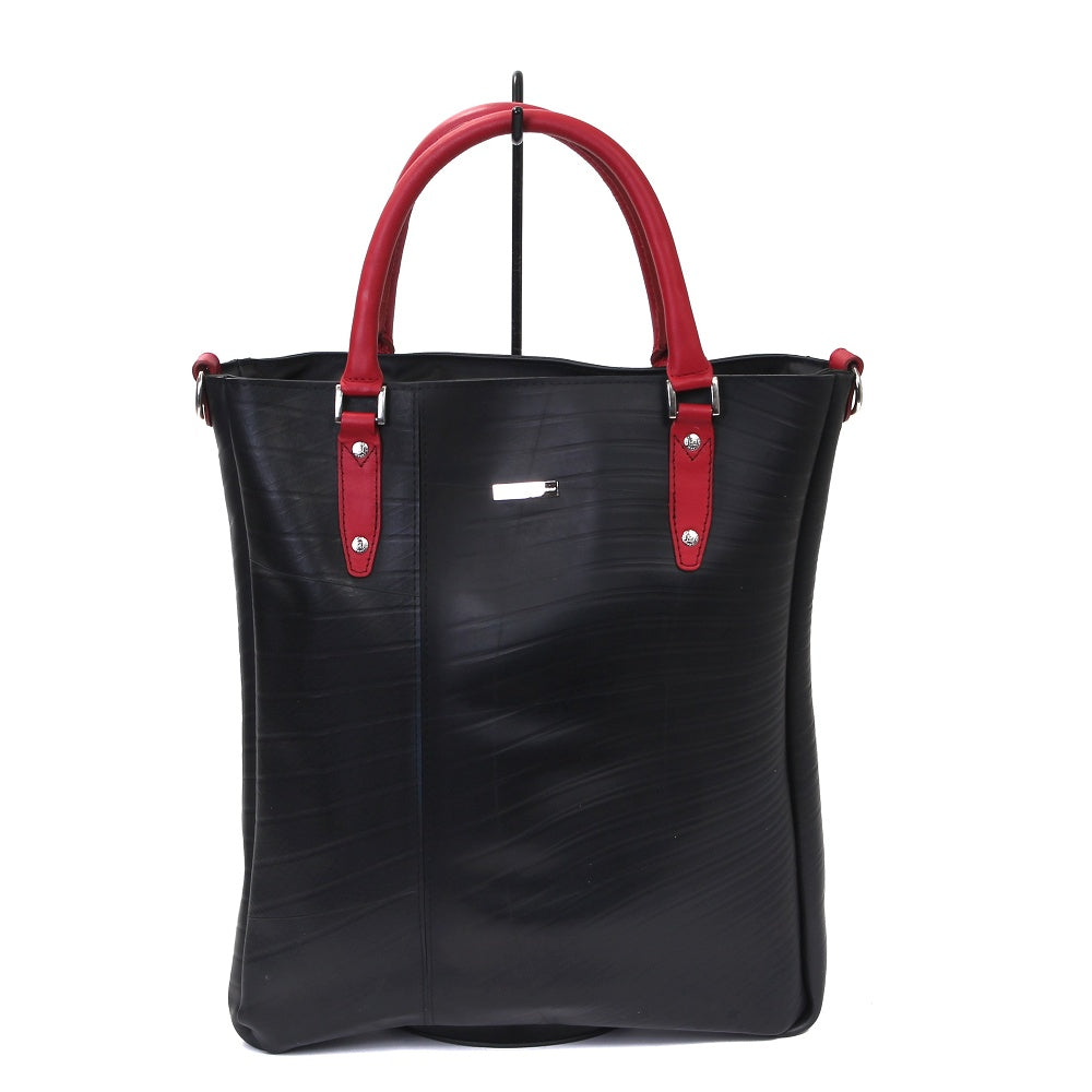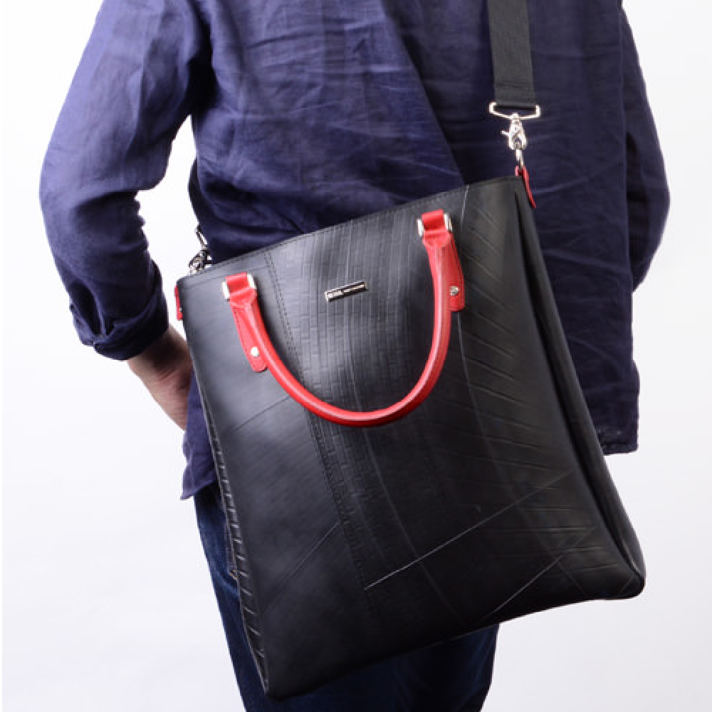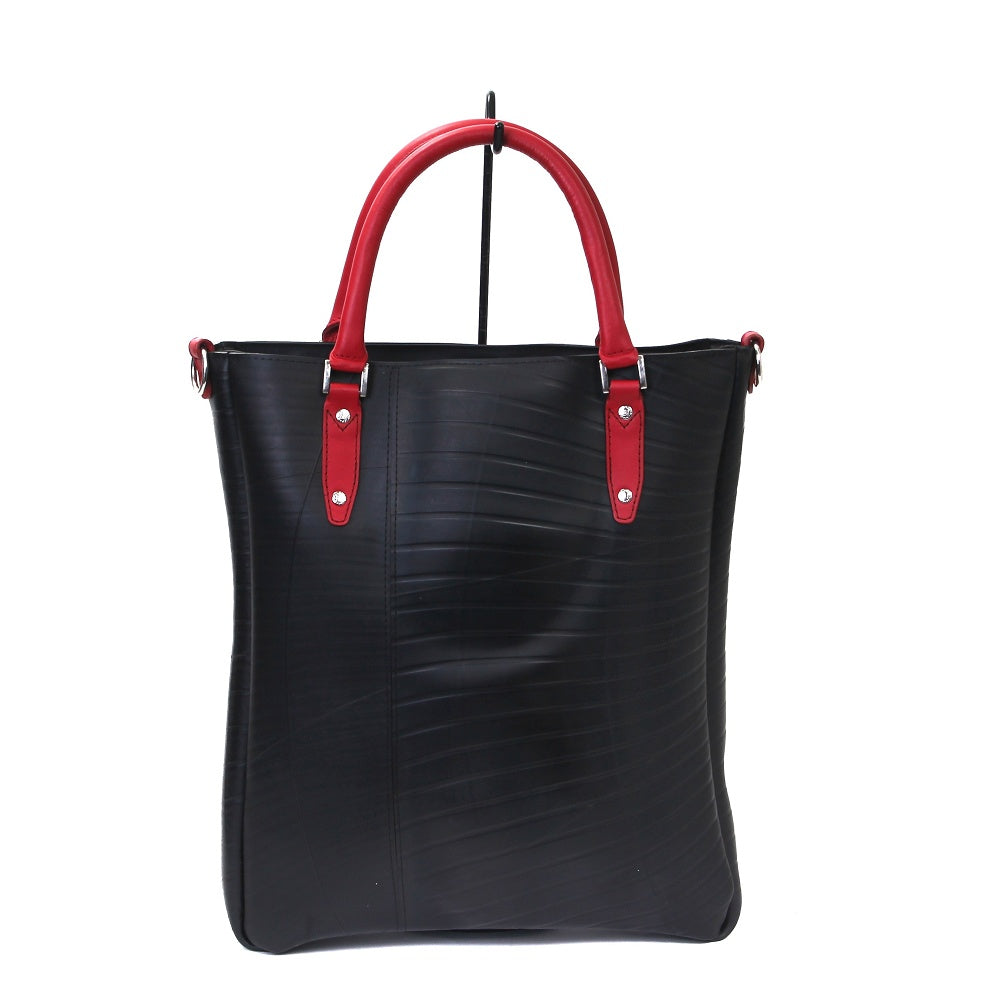 スタイリッシュな雰囲気を醸し出す縦長トートが登場!職人の高い技術により実現した全面をタイヤチューブで作り上げたタフなトートバッグです。シッックな雰囲気をも醸し出すデザインは、ビジネスシーンはもちろん、通学、デイリーユースでも活躍します。軽やかなフォルムからは想像が出来ない、B4サイズがしっかり入る大容量を兼ね備えたアイテムです。