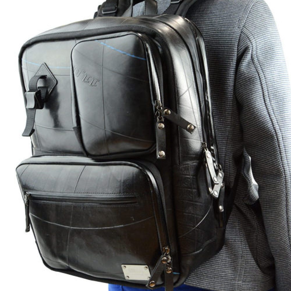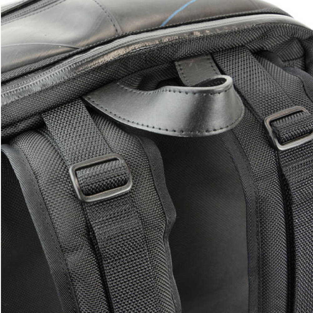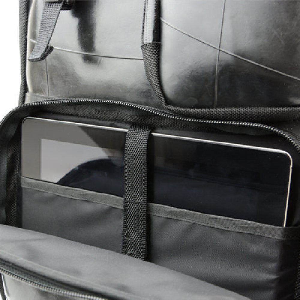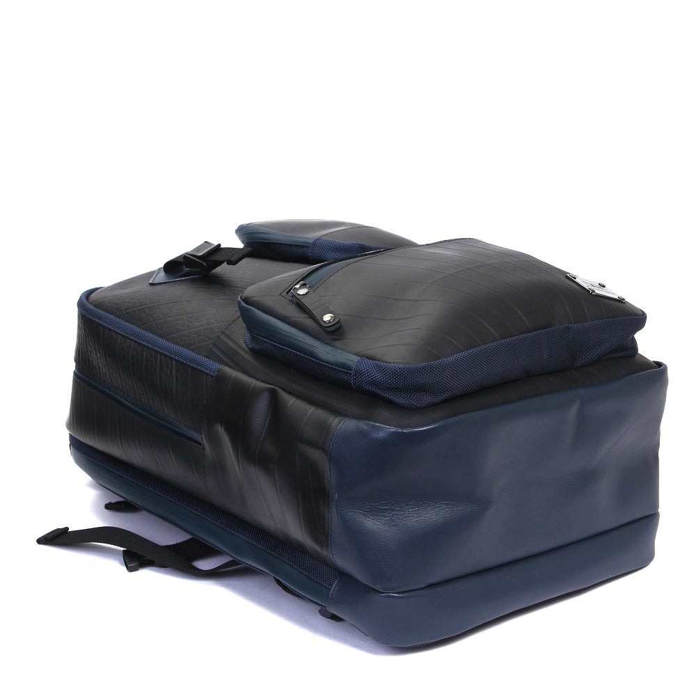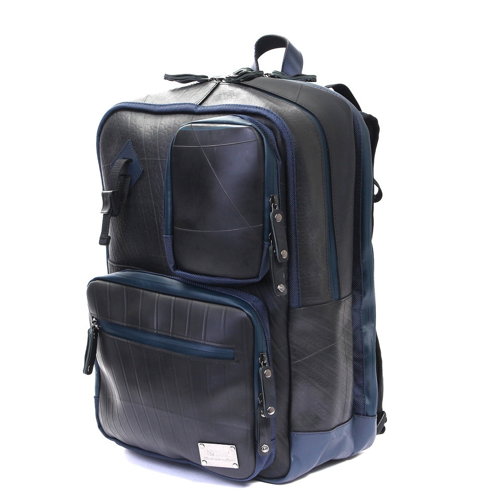 多彩な収納ポケットを搭載し、ノートPC(約W390×H270×D30mmまで)、iPadも同時収納可能なモバイラーズバックパック。さらに、重いモバイル機器を運ぶ事を想定し、負荷の強い部分を補強し、耐久性の強い素材を使用する事により、より強度を上げた商品です。 PC収納部分とメイン収納が完全に別れているセパレートタイプ。角度調整可能なパッド入りのショルダーストラップ、チェストストラップなど、フィット感や快適性にも優れています。底部分には、本革を使用しており高級感も感じさせる商品です。前面ポケットには脱着式のホルダーも搭載されており、防犯性にも優れています。 また、止水ファスナーを使用する事により防水性能を飛躍的に高めており、雨に弱いモバイル機器に最適の商品となっております。強靭なタイヤチューブの素材が衝撃や雨から大切なPCなどを守ります。 このモバイラーズバックパックは、一個辺り約2520gのCO2が削減されます。
