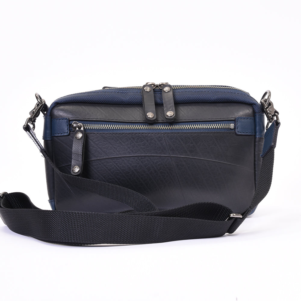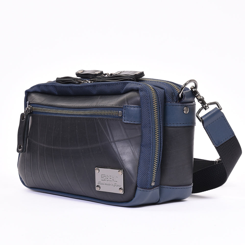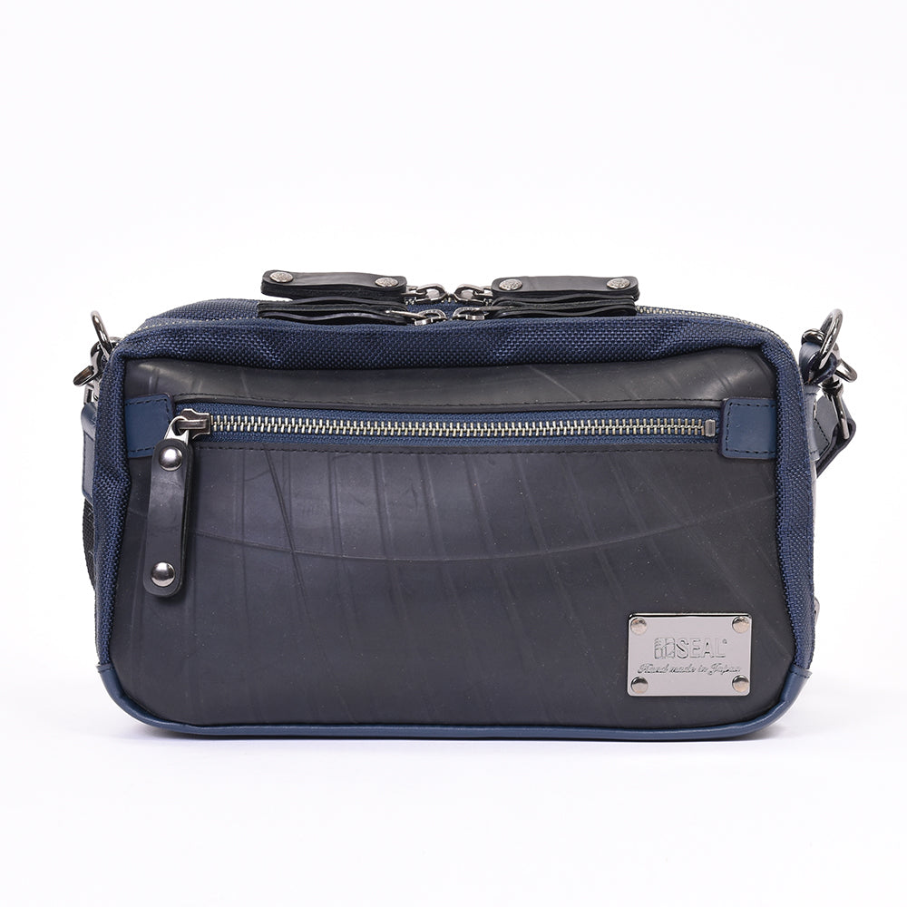 休日や旅行先でも重宝する、使い易いサイズのショルダーバッグ。パスポートやロングウォレット等もゆったりと入る大きさでサブバッグとしても大活躍します。網ポケットやペンホルダーなど、多彩な収納で荷物の小分けにも便利です。ファスナーポケットはメイン収納、サブ収納も含めて6つ搭載しており、防犯性にも長けています。シンプルなフォルムでスタイルを選ばすに使用でき、表面のタイヤチューブが水や汚れからバッグを守ります。このトラベルミニショルダーバッグは、一個辺り約840gのCO2が削減されます。