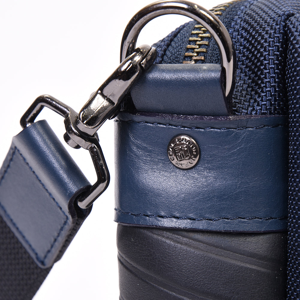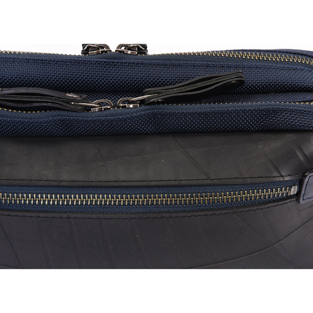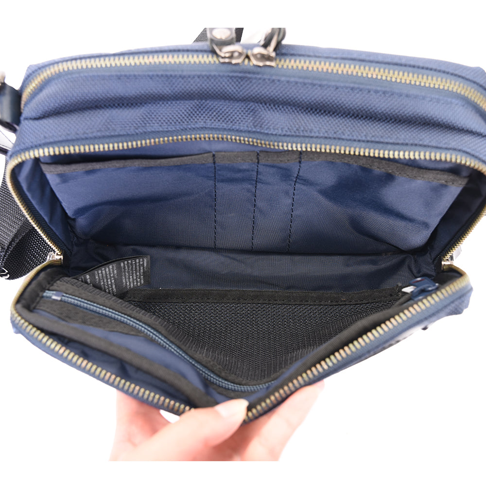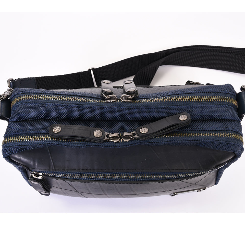 休日や旅行先でも重宝する、使い易いサイズのショルダーバッグ。パスポートやロングウォレット等もゆったりと入る大きさでサブバッグとしても大活躍します。網ポケットやペンホルダーなど、多彩な収納で荷物の小分けにも便利です。ファスナーポケットはメイン収納、サブ収納も含めて6つ搭載しており、防犯性にも長けています。シンプルなフォルムでスタイルを選ばすに使用でき、表面のタイヤチューブが水や汚れからバッグを守ります。このトラベルミニショルダーバッグは、一個辺り約840gのCO2が削減されます。