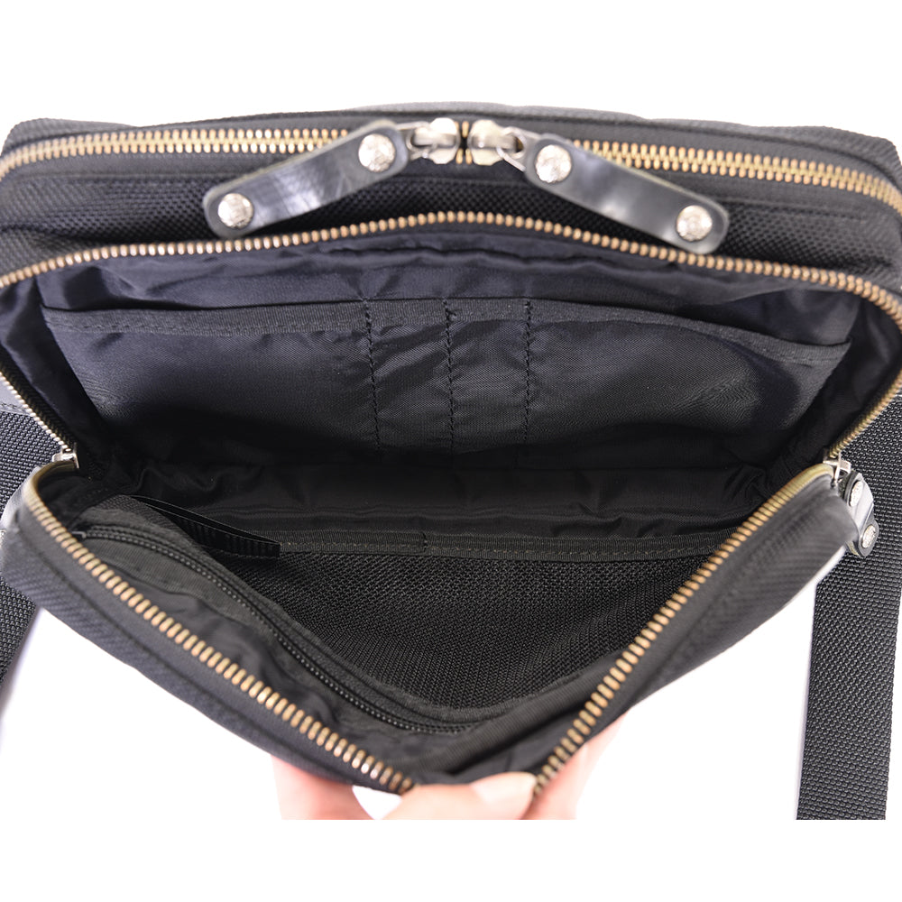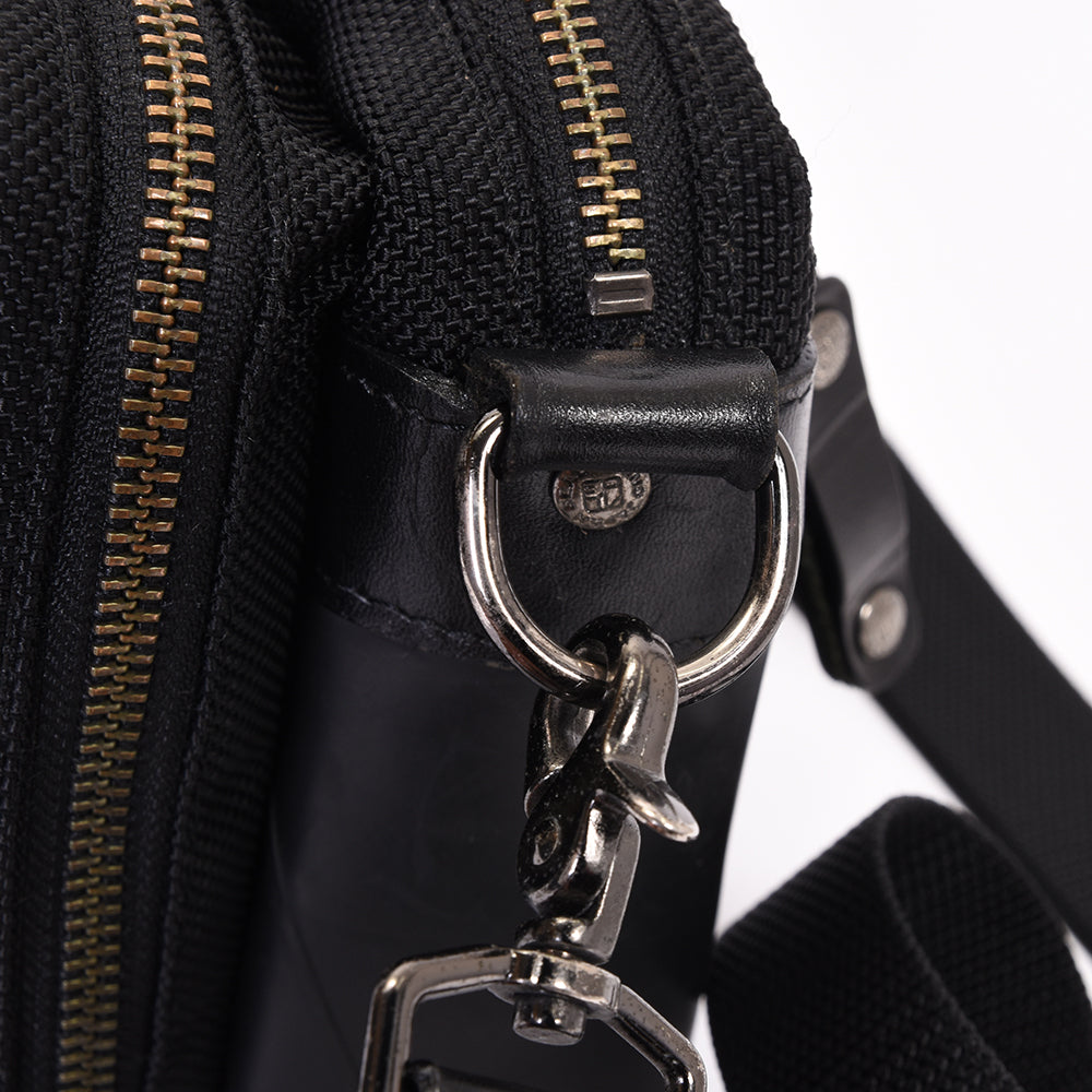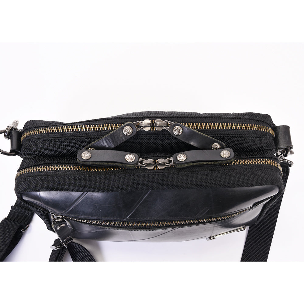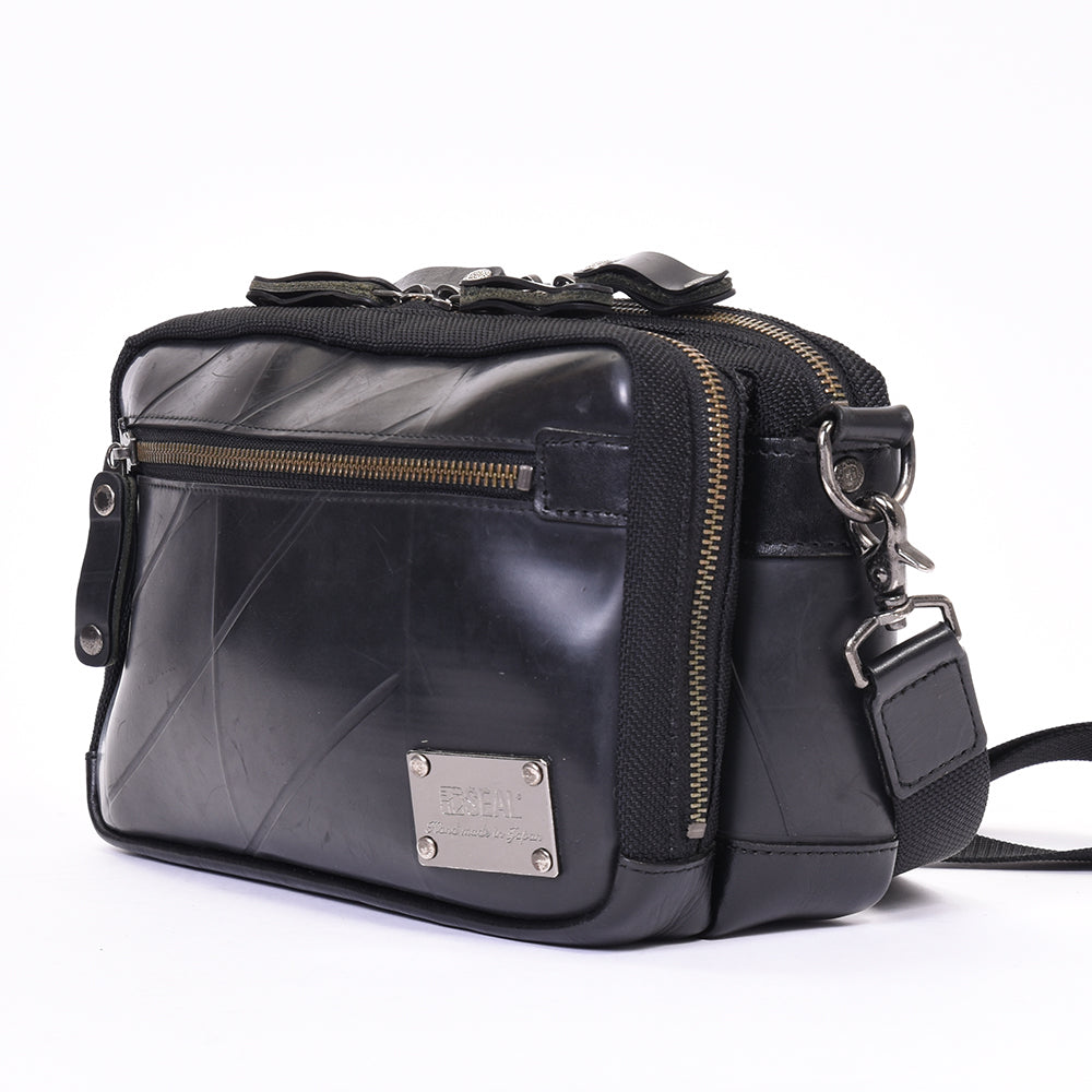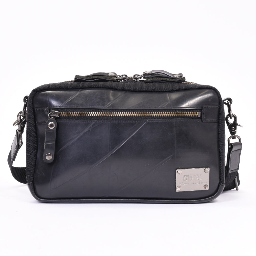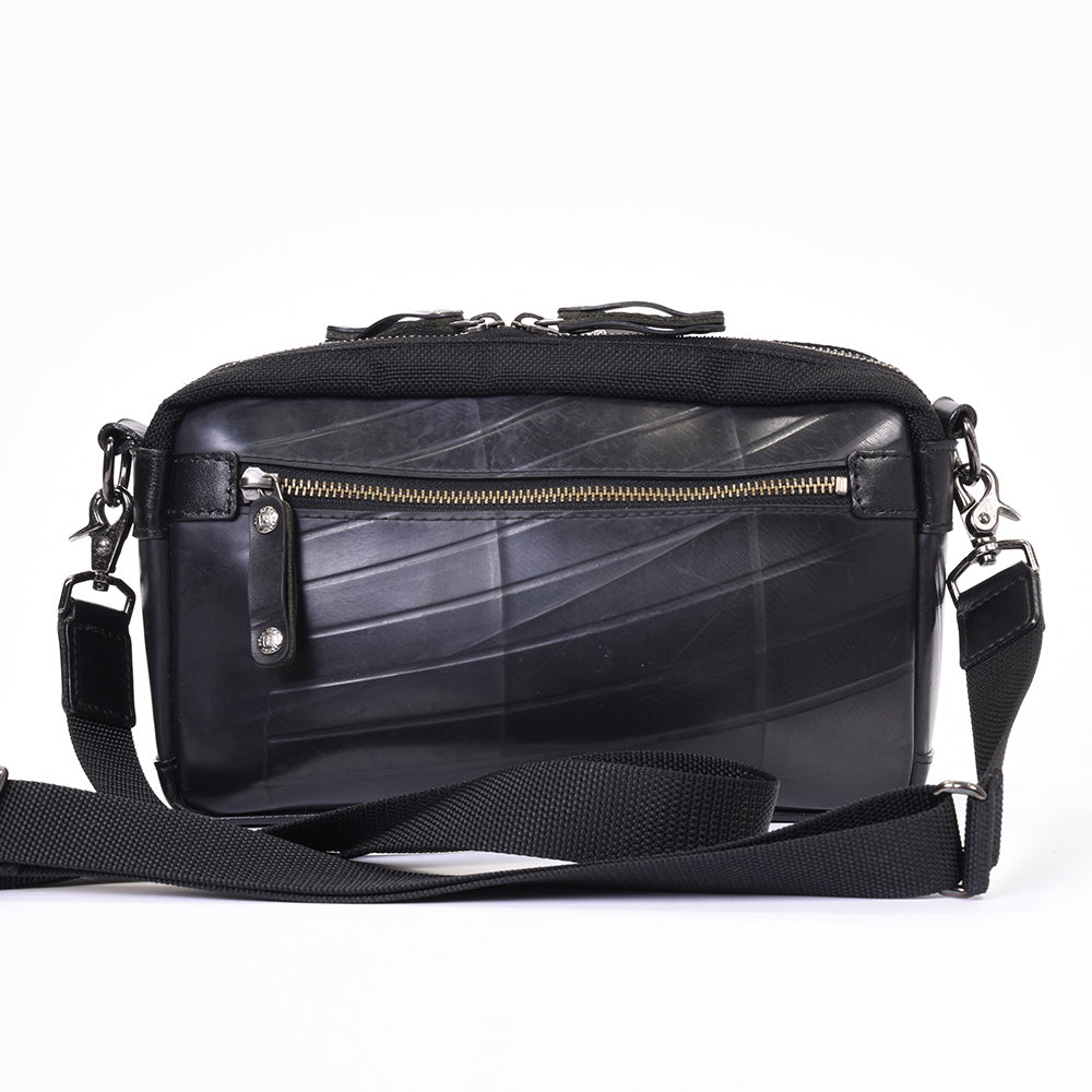 休日や旅行先でも重宝する、使い易いサイズのショルダーバッグ。パスポートやロングウォレット等もゆったりと入る大きさでサブバッグとしても大活躍します。網ポケットやペンホルダーなど、多彩な収納で荷物の小分けにも便利です。ファスナーポケットはメイン収納、サブ収納も含めて6つ搭載しており、防犯性にも長けています。シンプルなフォルムでスタイルを選ばすに使用でき、表面のタイヤチューブが水や汚れからバッグを守ります。このトラベルミニショルダーバッグは、一個辺り約840gのCO2が削減されます。
