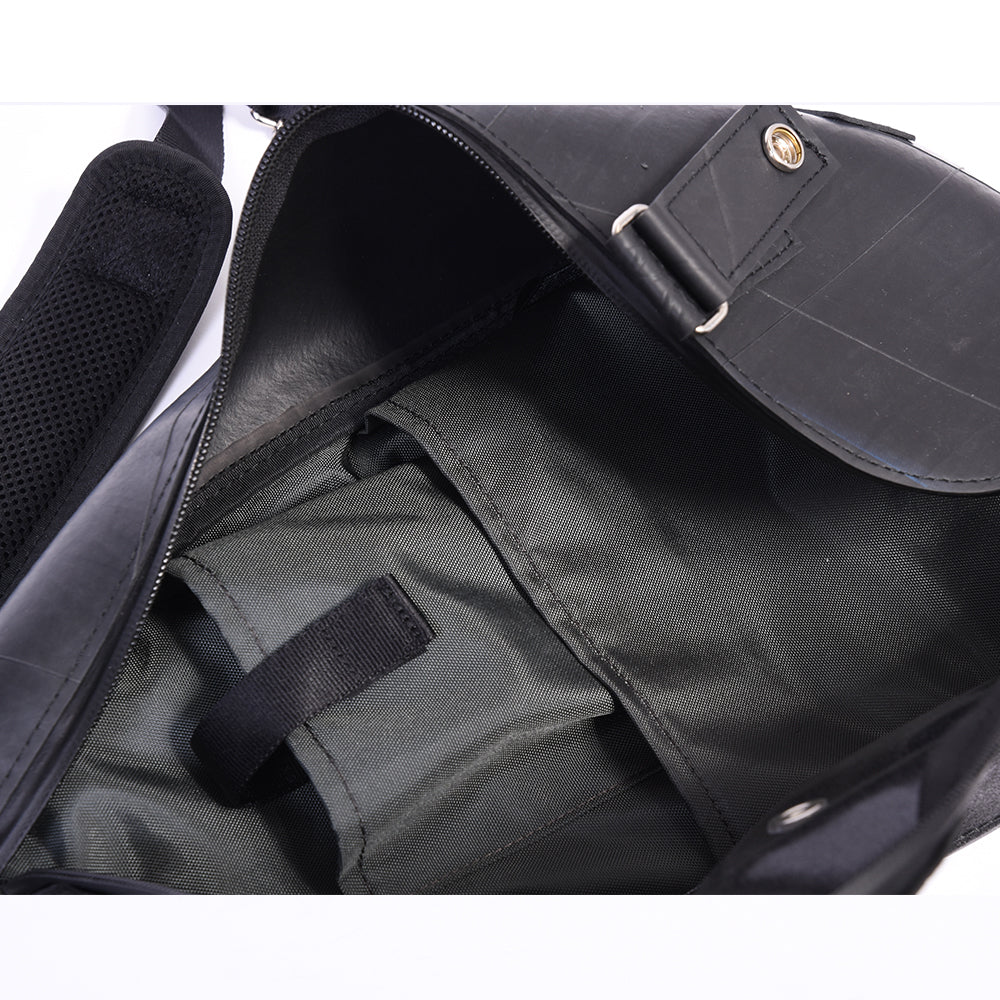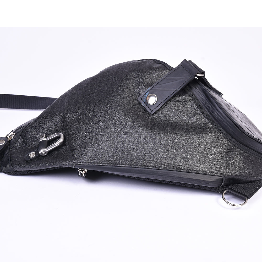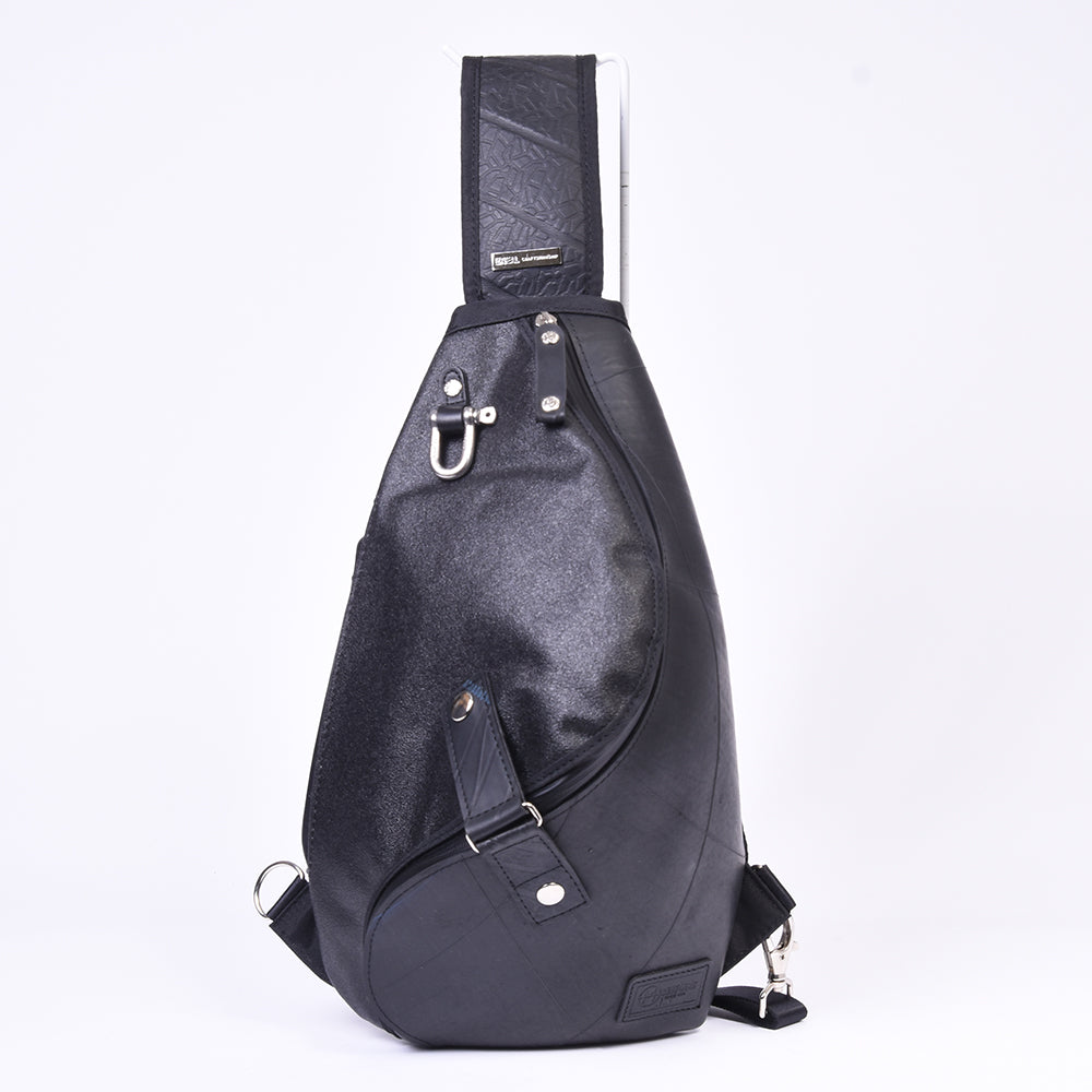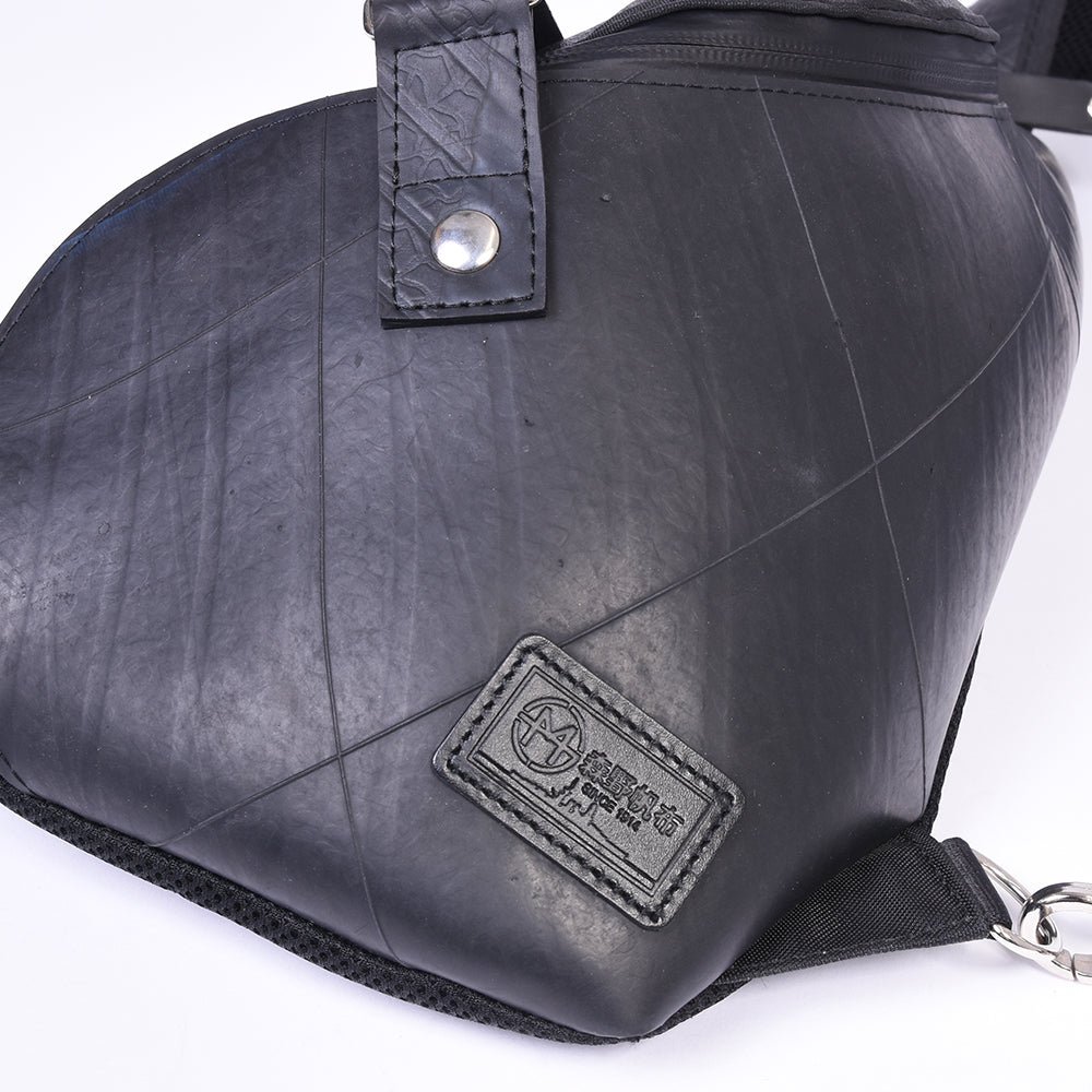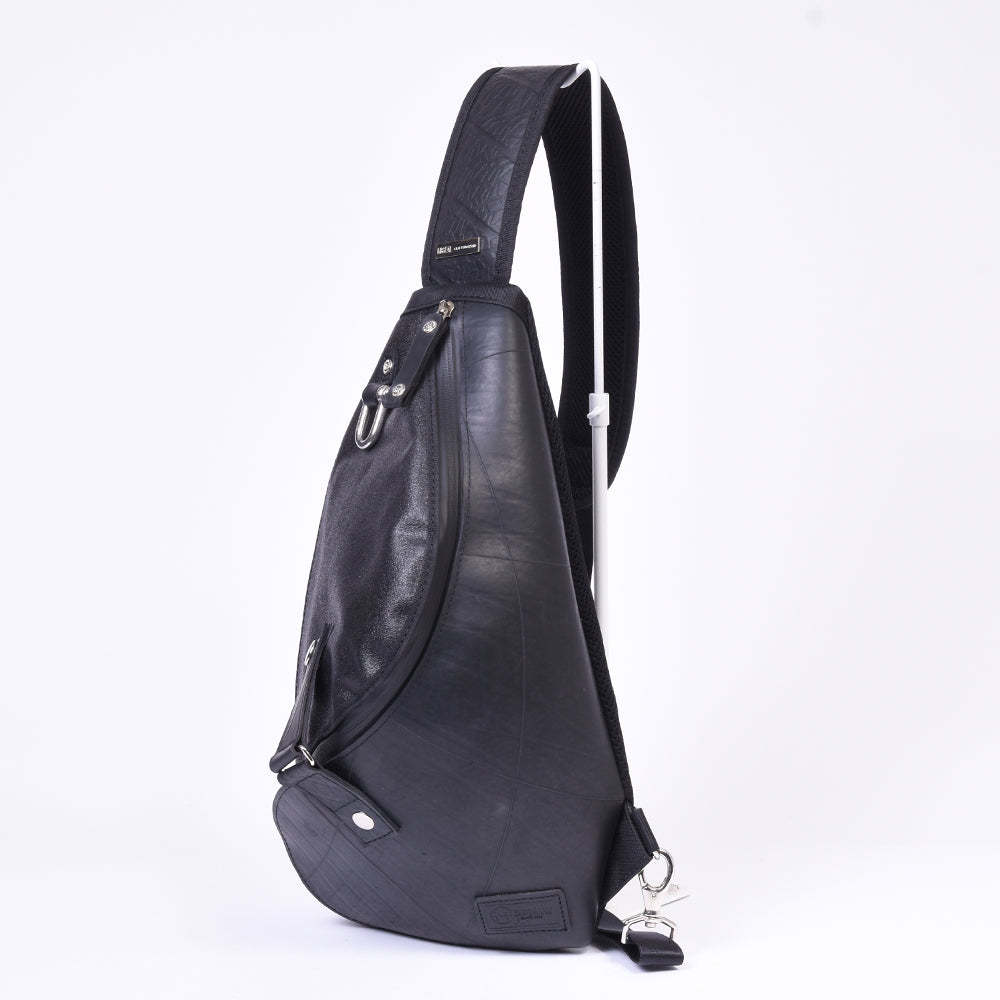 圧倒的な特徴のスパイラル状のフォルムを持つワンショルダーバッグに、使い心地を追求したプロモデルが新登場!タイヤ素材の弾性をそのまま活かす事により生まれたスパイラルフォルムは、タフな事はもちろん流れるようなフォルムの美しさが魅力です。その魅力を残し、背面全面に加えて本体から伸びるショルダーパッド部分にもメッシュ+緩衝材をプラス。アクティブシーンでも体にフィットしてストレス無くご利用いただけます。背負心地を考えて採用したショルダーベルト付け根部分の三角パーツや、中身をしっかりと見渡せるグレーの内装など、随所に使い心地を追求しています。内部についたスマートフォンポケットや、地図なども入れる事ができるオープンポケットなど、デイリーユースやちょっとした旅行でも活躍する機能も兼ね備えたモデルです。このワンショルダーバッグは、一個辺り約510gのCO2が削減されます。