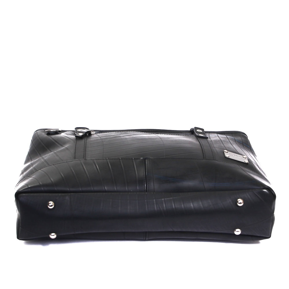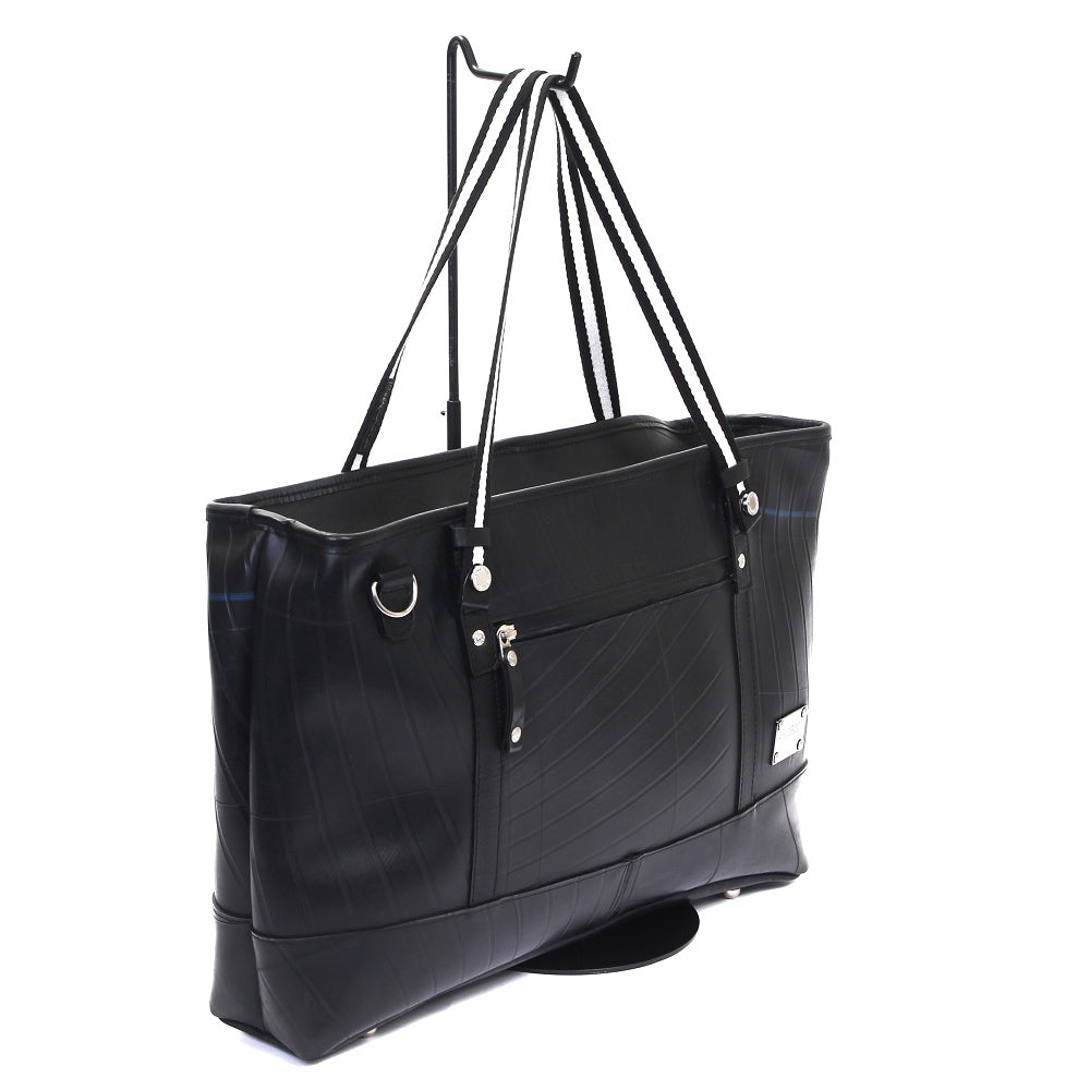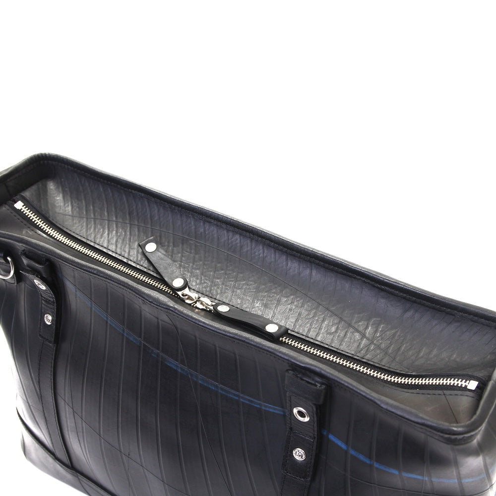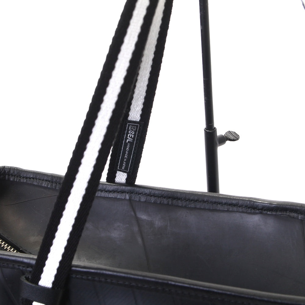 タイヤチューブを全面に使用したハードかつ堅牢なトートバッグ。シンプルなデザインと機能性は癖が無くどなたでも、どのようなシーンでも使い易いバッグとなっております。底鋲とマチ幅もあり、自立もしてくれます。メイン収納はファスナー開閉もより端から端までしっかりとカバー。メイン収納部は緩衝材付きポケットがございますので、ノートPCやタブレット端末も安心して持ち運びが可能になります。この製品はサンプル品だけの1点、特別モデルです。