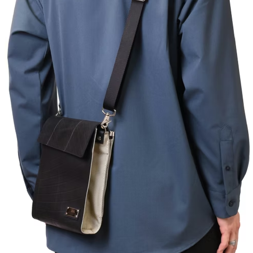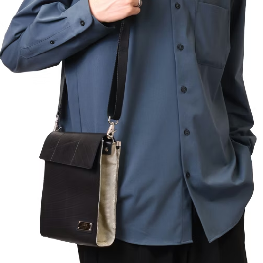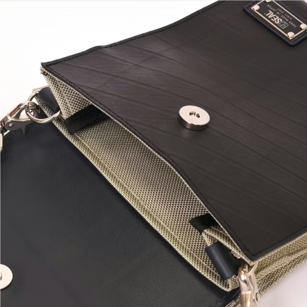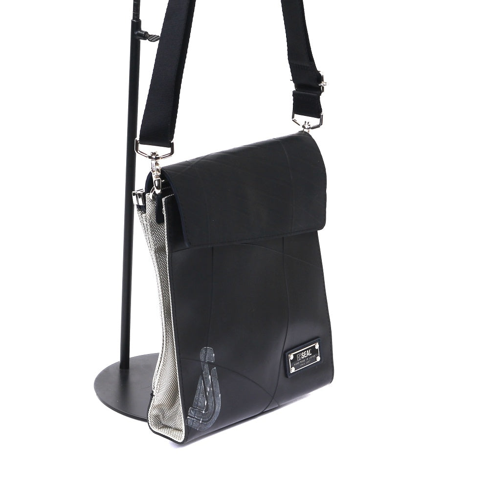 メイン収納とサブ収納で2層に分かれた特別な構造のスクエアタイプのショルダーバッグ。 タイヤチューブ製でフラップタイプのメイン収納は防水性も高く、出し入れがしやすい仕様になっております。 がま口フレーム仕様のサブ収納は間口をがっちりホールドするので、防犯性の高い仕様になっております。 スマホや、長財布なども収納できるゆったりとしたサイズ感。 容量によってサイズが変わる蛇腹仕様でコンパクトなのに大容量を実現しました。 直線がま口金具が印象的なユニセックスデザインのショルダーバッグです。 このキスロックスクエアショルダーバッグは、一個辺り約1155gのCO2が削減されます。。
