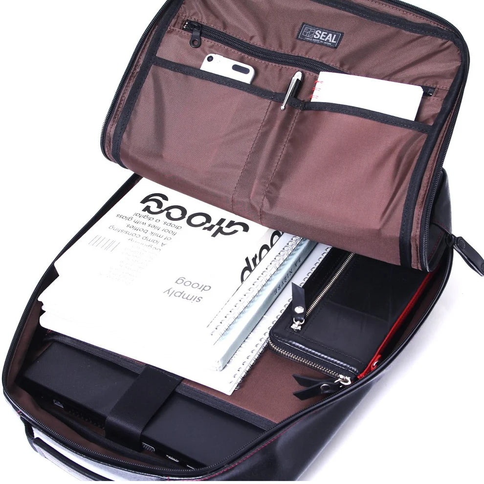 外部:止水ファスナーポケット×1 内部:PC収納×1※Mac book pro 15inch収納可能 内部:フリーポケット×2 内部:ペンホルダー×1 内部:ファスナーポケット×1 |