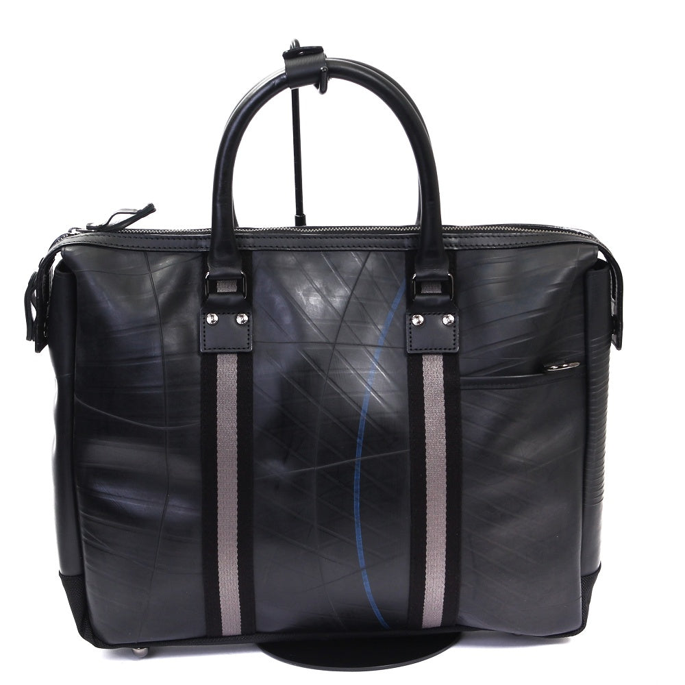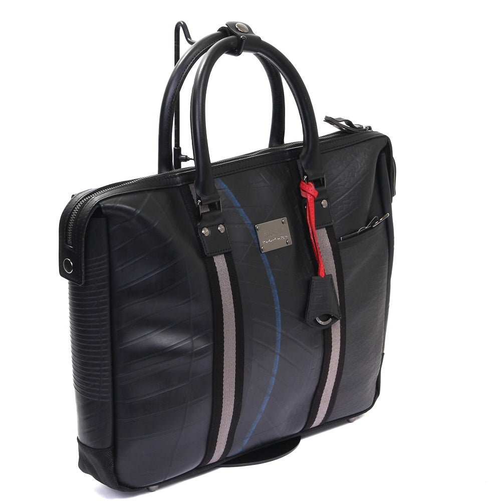 オンとオフ両方で使える、ビジネスバッグ。日本製の質の高いストライプテープを使用した、職人の細かな作業を感じることができる逸品です。特注のオリジナルのキーリングを搭載し、15インチのパソコンも収納できる使いやすいビジネスバッグです。薄マチタイプで、見た目もスッキリし、スタイリッシュな雰囲気を演出してくれます。 このストライプビジネスバッグは、一個辺り約1350gのCO2が削減されます。