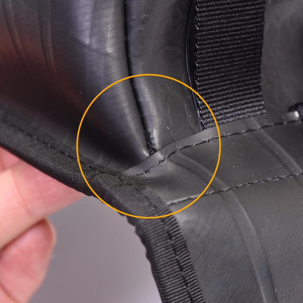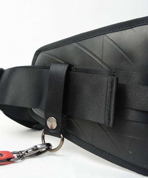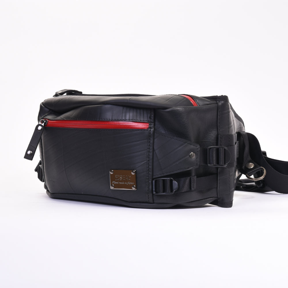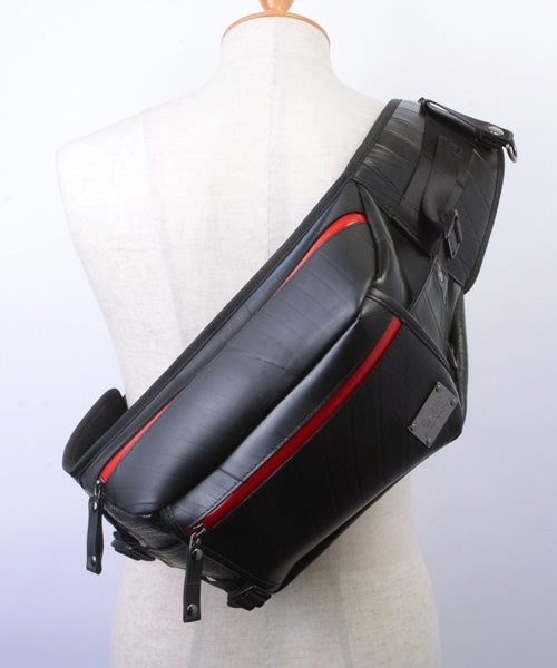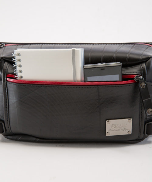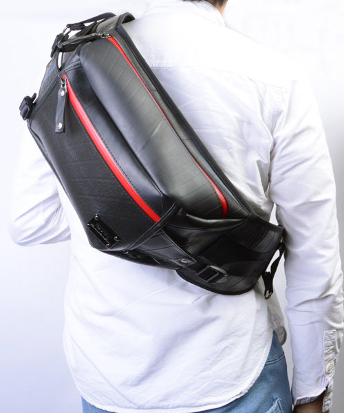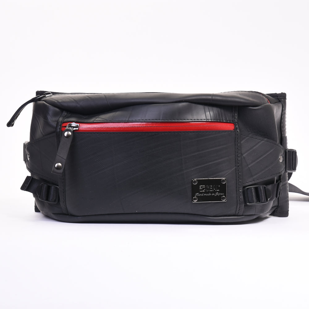 体を包み込むようにフィットする大容量ボディバッグが登場。ほぼ全面をタイヤチューブで製作、ファスナーは止水ファスナーを採用しているため、防水性は非常に高い製品です。左右に付属している取り外し可能なストラップホルダーや、サイズを調節可能なベルトなどデイリーユースはもちろん、旅行先でも嬉しい昨日を多数搭載。複雑なタイヤチューブの組み合わせを、国内職人の技術によりしっかりと組み合わせた逸品です。 この2WAYボディバッグは、一個辺り約1,470gのCO2が削減されます。