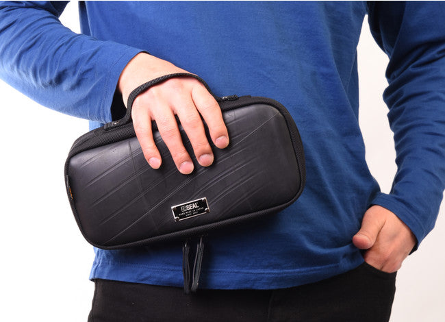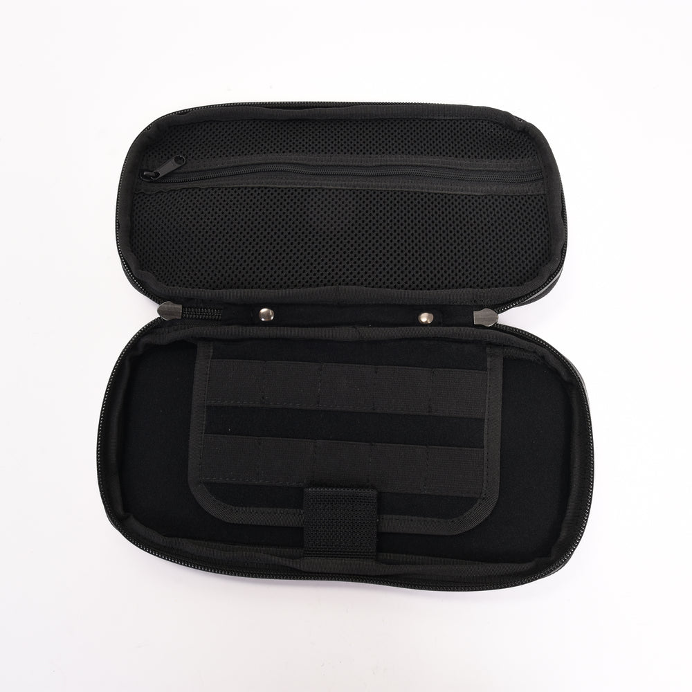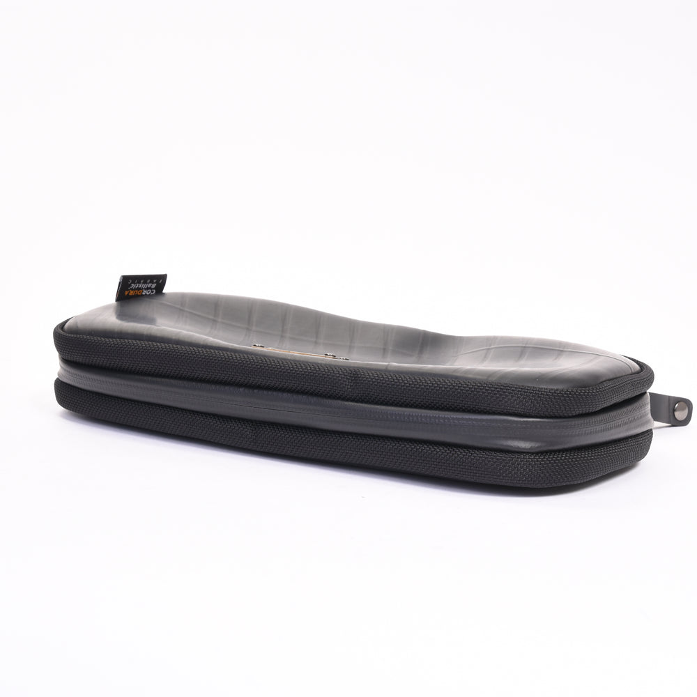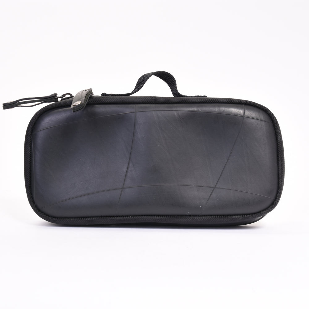 タイヤチューブ以外の生地にはコーデュラナイロンを採用し耐久・耐水性の高いアイテムとなっています。収納部は片側がSwitch本体と専用ソフト収納、反対側はアダブター等を収納できるメッシュポケットを搭載。専用ソフトは10枚まで収納することができます。Switch本体の液晶画面を保護するため、ソフト収納との仕切りにはクッション素材を採用しています。また反対側のメッシュポケットのサイドにもクッション素材を使用することで収納したときにSwitch本体のジョイコンを圧迫しないように設計されています。ハンドルはしっかりと手に馴染み、持ち運びにも便利です。鞄の中に入れてもタイヤチューブ素材は丈夫な素材のため簡単に押しつぶされることがなく、衝撃からもしっかりと守ります。