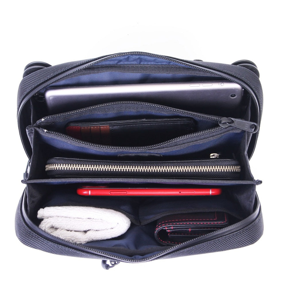 オーガナイズ性に優れた内装で、全てのものを自在に機能的に収納可能。 貴重な時間を無駄にせず、すばやく目的のものにアクセスできるショルダーバッグです。 前面には日常や外出先で頻繁に使用する、鍵や交通カードなどを収納可能なクイックポケットを搭載。 機能的な内装からは想像がつかない、シンプルな外装でどんなコーディネイトにも合うデザインになっております。 素材は全面的に防水素材を採用しており、雨や汚れなどを気にせずご利用いただけます。 また、ショルダーストラップは脱着可能になっており、インナーポーチやクラッチバッグとしてもご使用になれます。 この脱着可能なショルダーバックルは回転駆動式になっており、ショルダーの長さや体型に合わせて自在に調節してくれます。