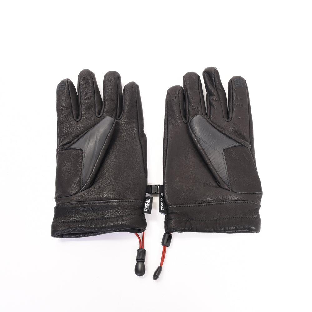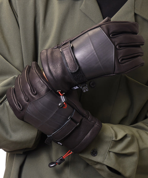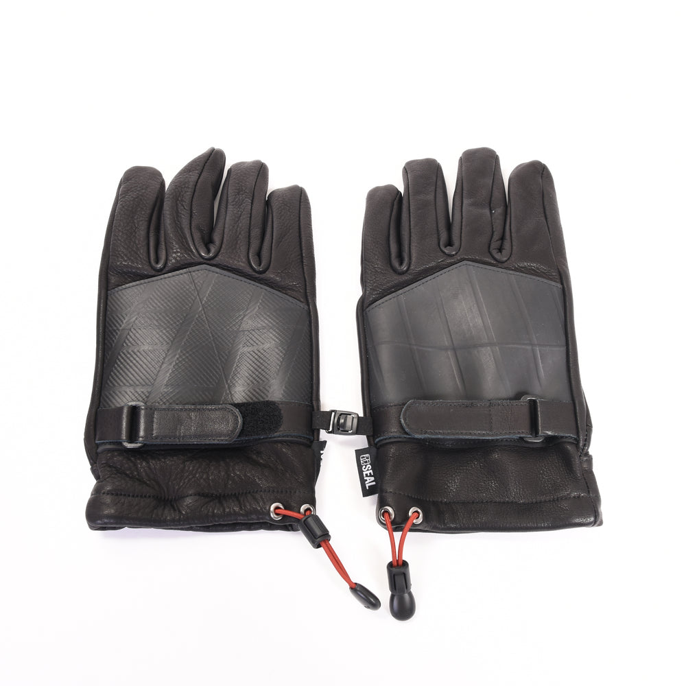 肉厚の上質な本革とタイヤチューブで作られた最強グローブ 都会でも郊外でもバイクや自転車での移動シーンをサポートする上質なレザーグローブ。指先の動きに合わせた立体縫製によって、違和感なく手に馴染むグローブに仕上がっています。 人差し指部分に導電糸刺繍を入れているので、スマートフォンやタッチパネルも手袋をはめたままで楽々操作出来ます。 内側の生地には、滑らかなマイクロフリースを使用した保温性抜群の作り。 甲部分と掌部分の内装の厚さを変えることにより暖かさを保ちながらグリップしやすいグローブになっております。 リストベルトとドローコードを絞ることで細かなサイズ調節も可能に。 左右を連結することができるミニバックル付きで、手袋の片方が紛失する心配を軽減してくれます。 このSEAL グローブ for Touchは、一個辺り約540gのCO2が削減されます。