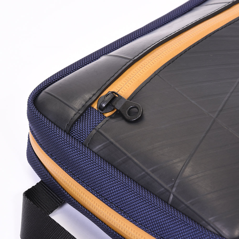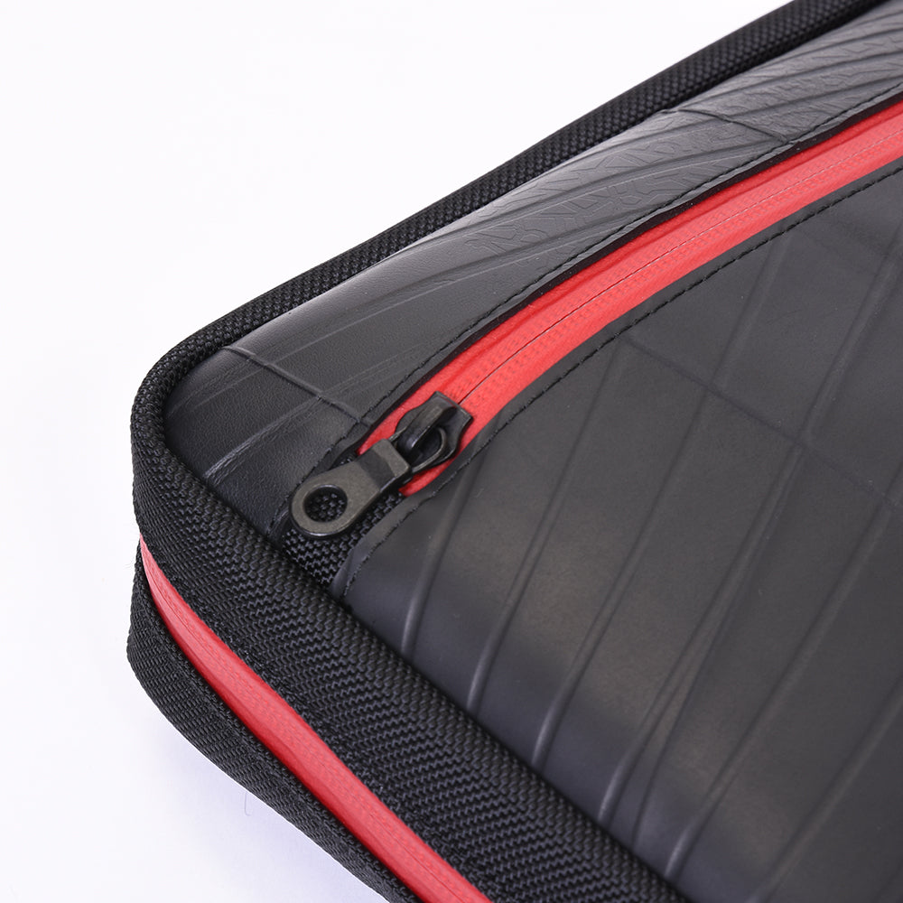 車のタイヤチューブと防水ナイロン、止水ファスナー、そして前面と背面に贅沢に使われる緩衝材を組み合わせることで、高い防水性と耐衝撃性を実現。大切なガジェットを水濡れや衝撃から徹底的に守ります。
