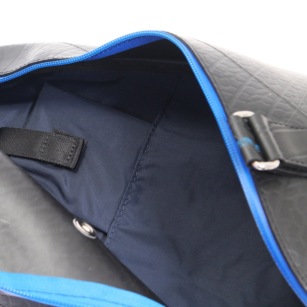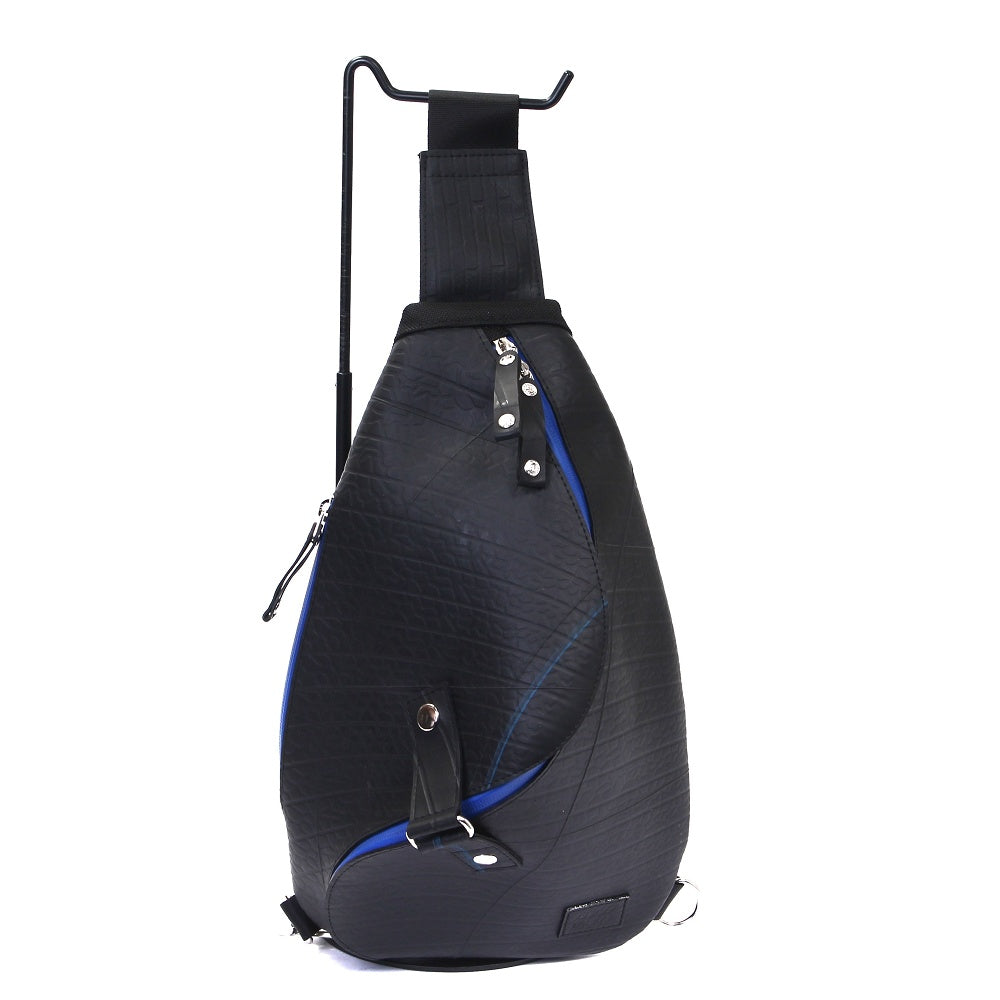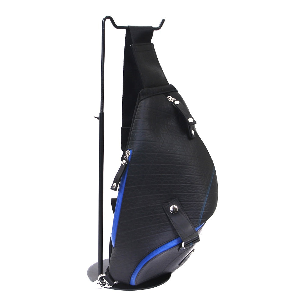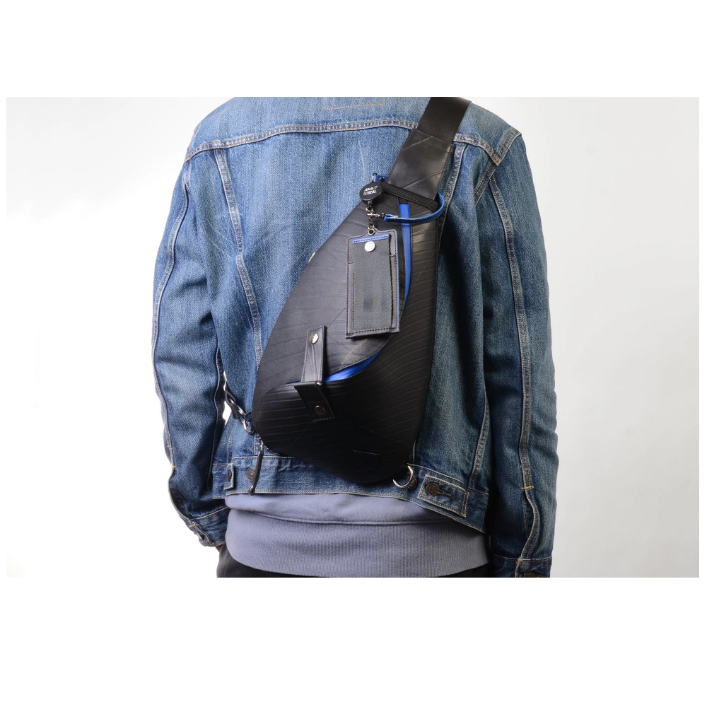 ANA旅客機で使われていた廃材の一部を使用した、「ANA」とのコラボ商品のオリジナルワンショルダーバッグ。他にはない、圧倒的な特徴のスパイラル状のフォルムはタイヤ素材の弾性をそのまま活かす事により生まれ、タフな事はもちろん流れるようなフォルムの美しさが魅力です。ワンショルダーならではのスマートなデザインながら長財布や500mlのペットボトルも十分入る収納力は普段使いやちょっとした遠出にも活躍します。背面にはクッションが入っているので仕様時のストレスも最大限軽減します。取り外し可能なパスケースは伸縮性のあるリールを使用しており、鞄につけたまま使用することができます。このワンショルダーバッグは、一個辺り約410gのCO2が削減されます。