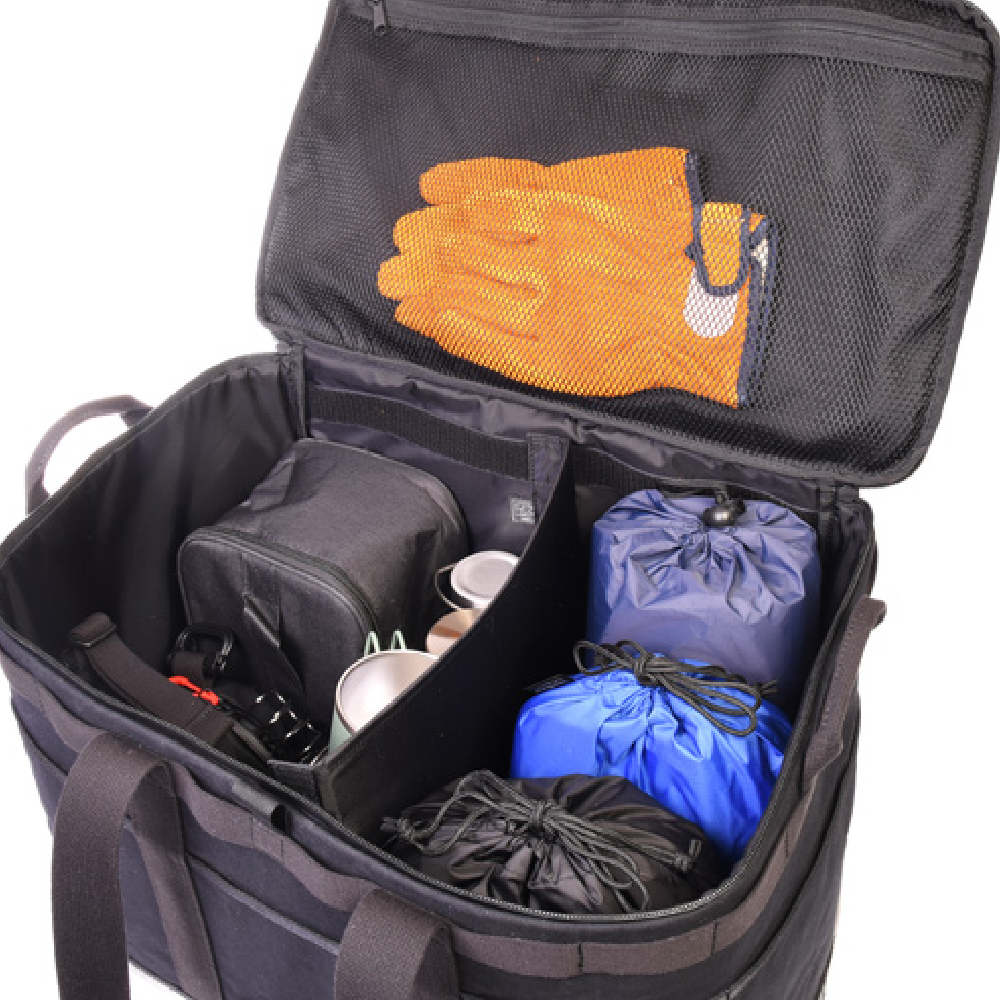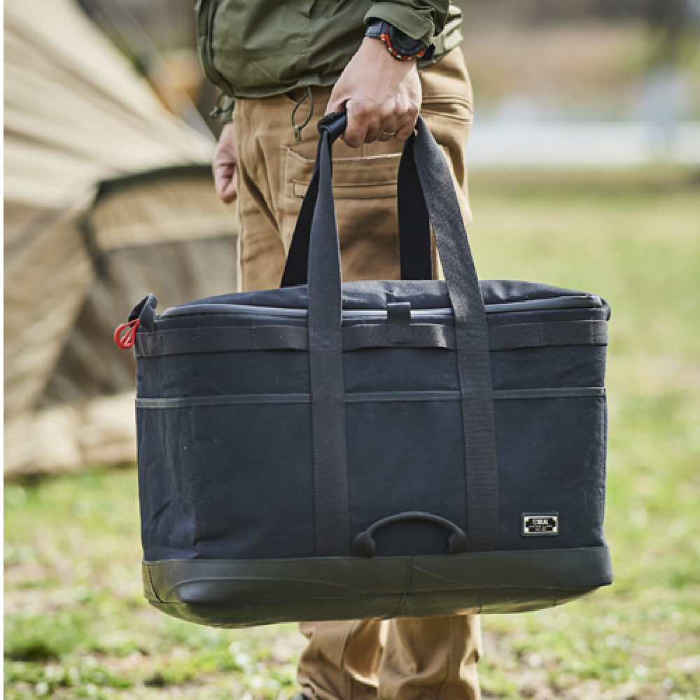 日本職人がこだわり、作り上げた垂涎物のキャンプギア 国内職人の手により一つ一つ丁寧に作り上げられた、タフさと機能性を兼ね備えたアウトドアシリーズのギアコンテナのLサイズ。Mアイズのほぼ倍の容量を収納可能な大きめサイズのギアコンテナ。製品本体にはSEALの特徴である捨てられたタイヤチューブ素材と、アメリカ連邦規格により定められた本物の”ミルスペック”の コットン生地を採用。それぞれのバックル部分にもミルスペックのグリムロックを採用したプレミアム性の高いアイテムです。 キャンプでの使用を徹底的に考え設計されたデザインで、ギアコンテナには付属されたポータブルバッテリー専用ポケットや、使わない時にはコンパクトに折りたたんで収納することが出来るなど、細かな機能も充実しています。水を一切通さないタイヤチューブに加えて、パラフィン加工がされた高密度で織り込まれたコットンにより、突然の雨でも安心してご利用いただけます。 底面全面にタイヤチューブを採用しているため、泥汚れや濡れた地面にも気にせず置くことが可能。ギアコンテナの内部は仕切り板で自由に仕切り位置の変化ができるので、季節や内部の様々なギアに合わせてカスタマイズが可能です。レジャーでの利用はもちろん、上面の蓋を折り畳むことによりトートバッグとしても使える2WAY仕様。普段はトートとしても利用しながらキャンプの時にはギアボックスとしても使える柔軟性の高いアイテムです。このSEAL OUTDOOR ギアコンテナ(L)は、一個辺り約3360gのCO2が削減されます。