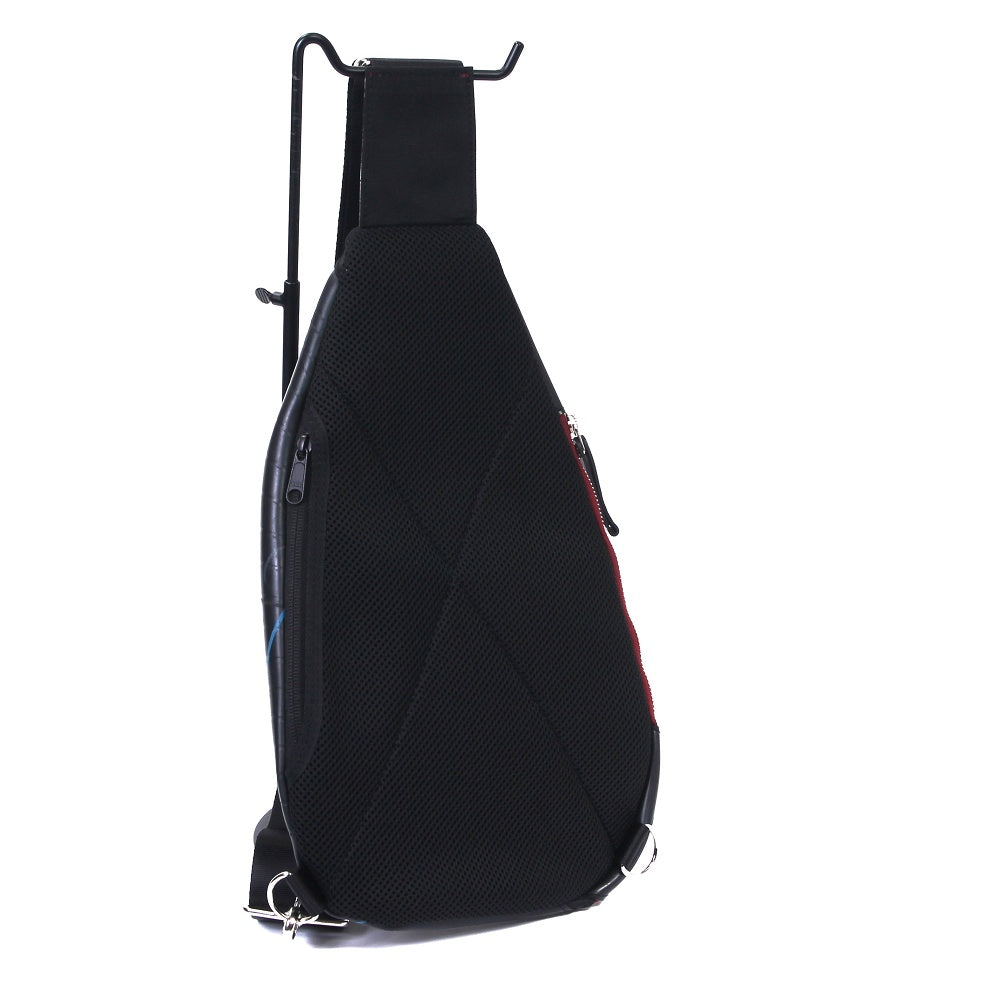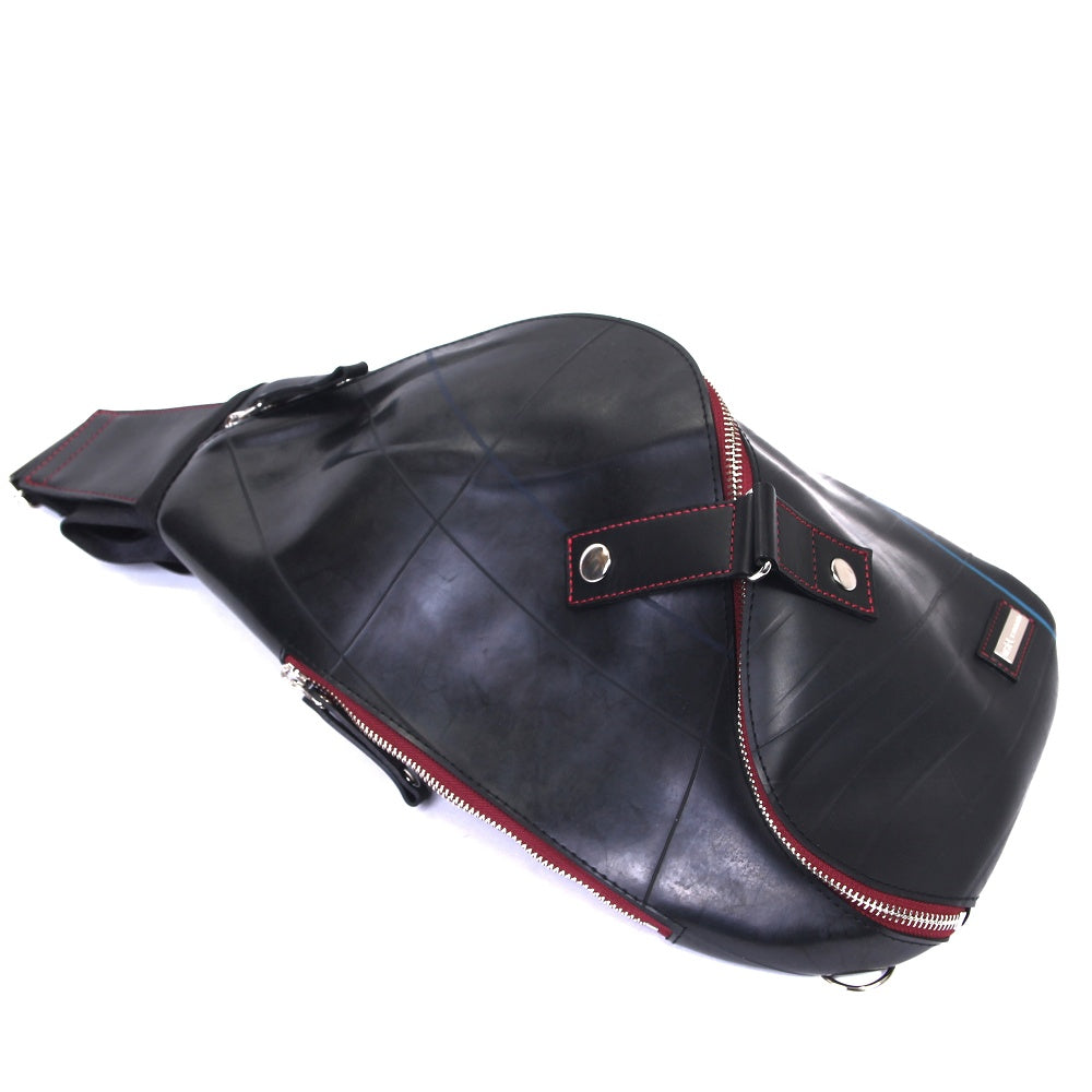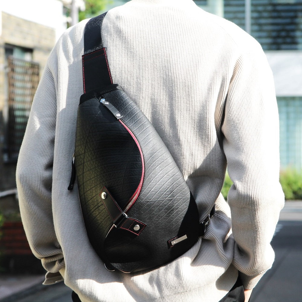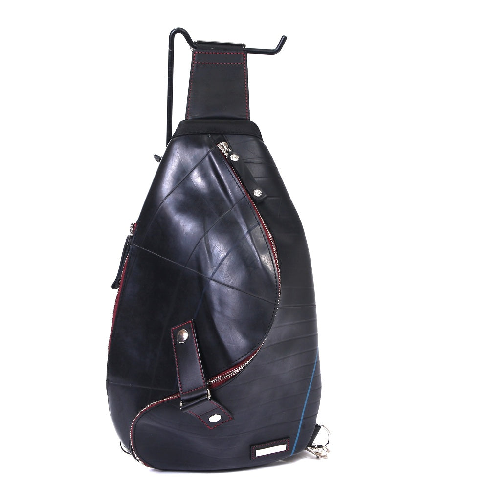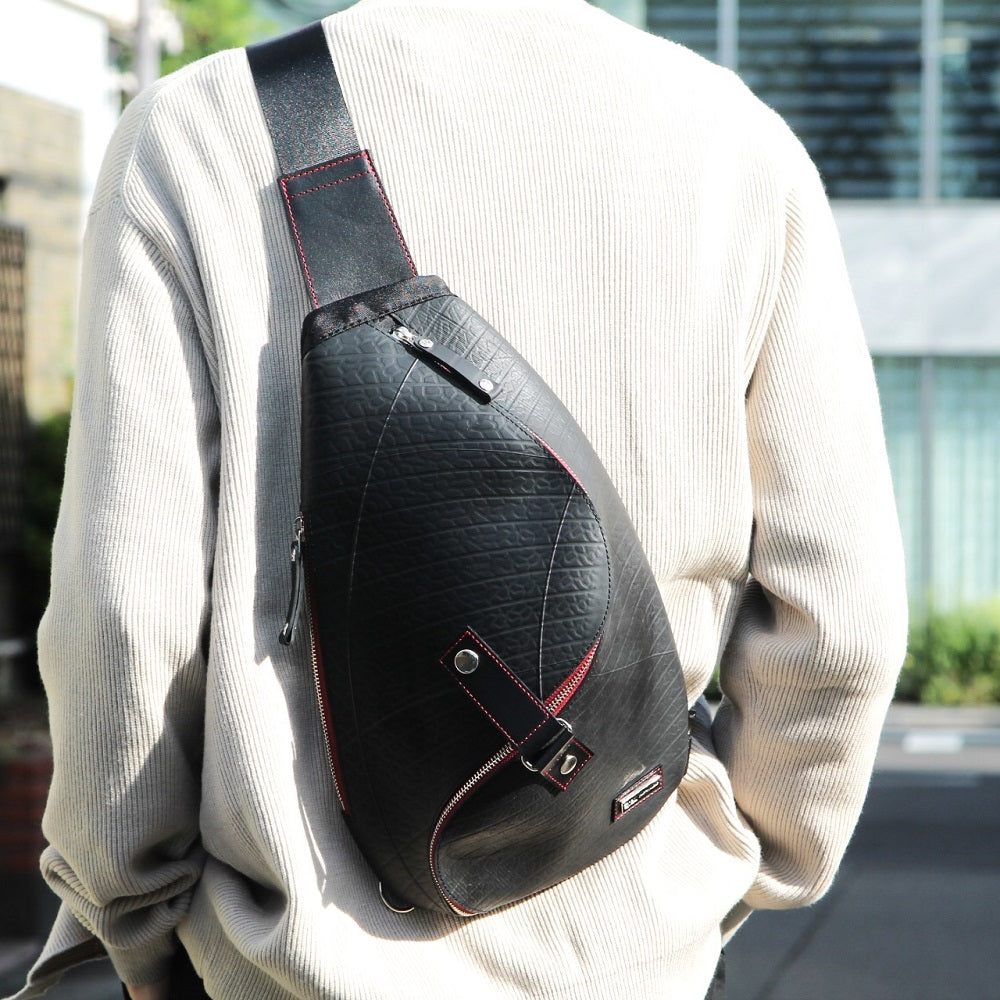 タイヤ素材の弾性をそのまま活かす事により生まれたスパイラルフォルムは、タフな事はもちろん流れるようなフォルムの美しさが魅力です。ワンショルダーならではのスマートなデザインとシャツや本などでも十分入る収納力は普段使いやちょっとした遠出にも活躍します。背面はクッション性のメッシュ素材になっており使用時のストレスも最大限軽減します。更に路面店限定は背面に独立したファスナ―ポケットを搭載し、ミニタブレットも入るスペースでよく出し入れするウォレット等の収納にも便利。内部についた携帯ポケットや、地図なども入れる事ができるオープンポケットなど機能面も充実しています。 このワンショルダーバッグは、一個辺り約720gのCO2が削減されます