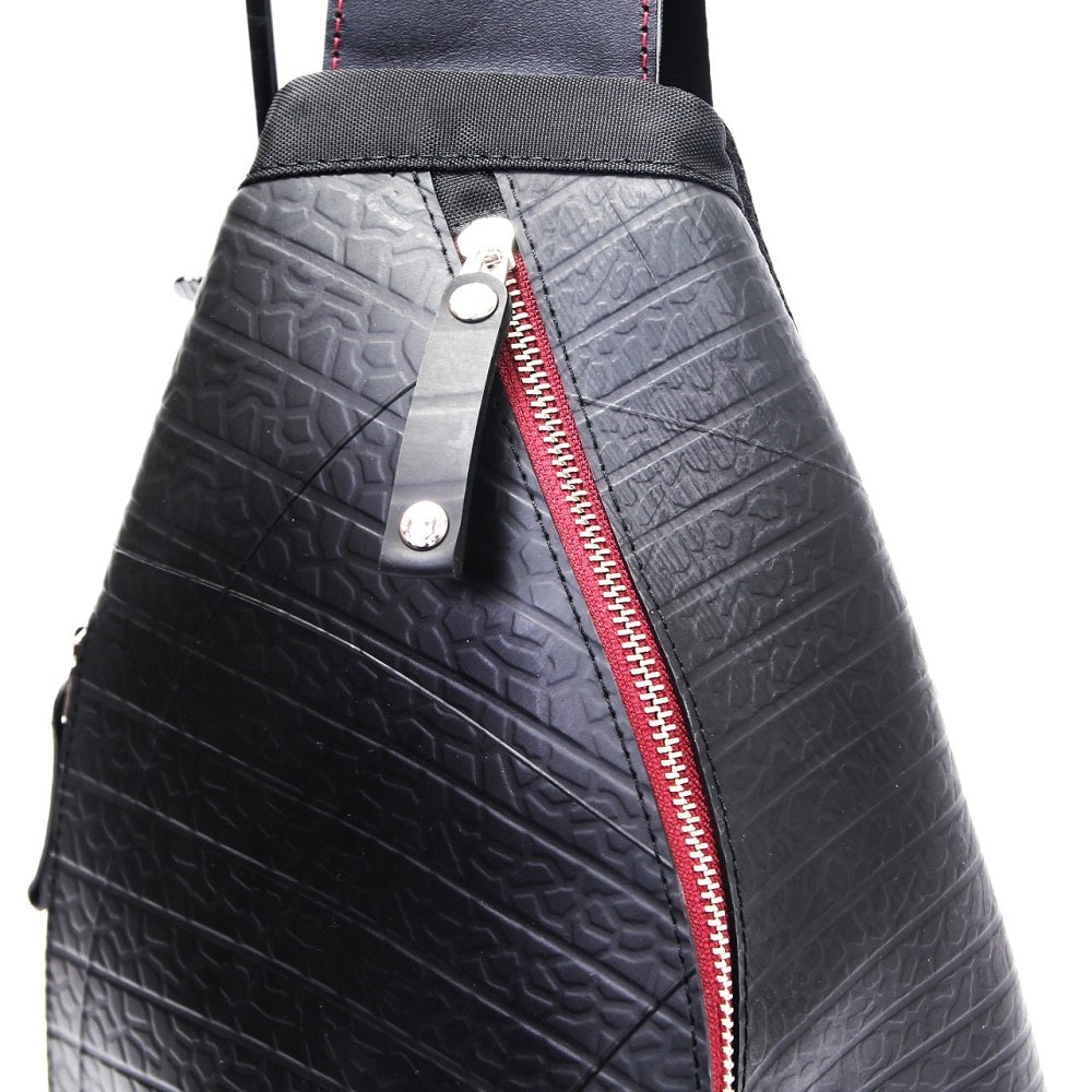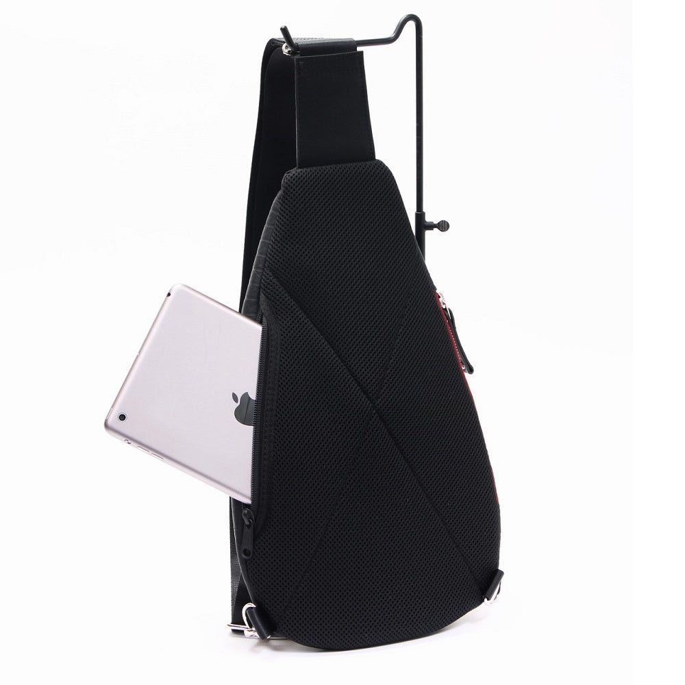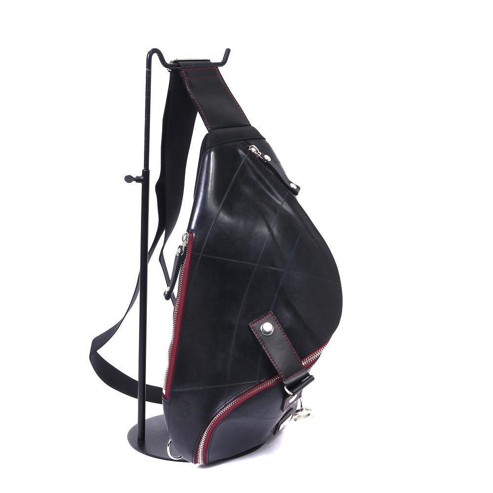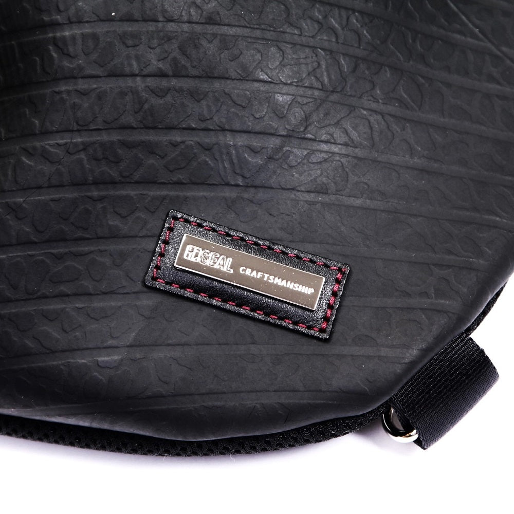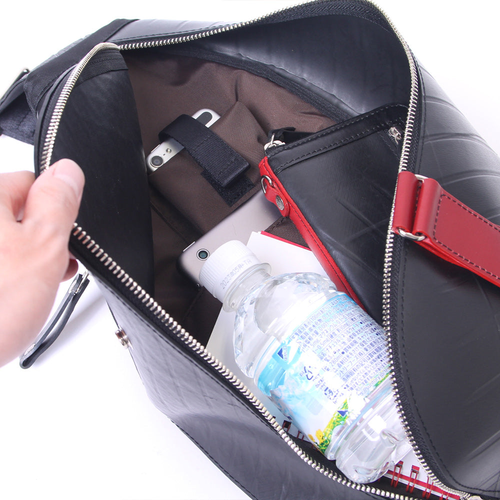 タイヤ素材の弾性をそのまま活かす事により生まれたスパイラルフォルムは、タフな事はもちろん流れるようなフォルムの美しさが魅力です。ワンショルダーならではのスマートなデザインとシャツや本などでも十分入る収納力は普段使いやちょっとした遠出にも活躍します。背面はクッション性のメッシュ素材になっており使用時のストレスも最大限軽減します。更に路面店限定は背面に独立したファスナ―ポケットを搭載し、ミニタブレットも入るスペースでよく出し入れするウォレット等の収納にも便利。内部についた携帯ポケットや、地図なども入れる事ができるオープンポケットなど機能面も充実しています。 このワンショルダーバッグは、一個辺り約720gのCO2が削減されます